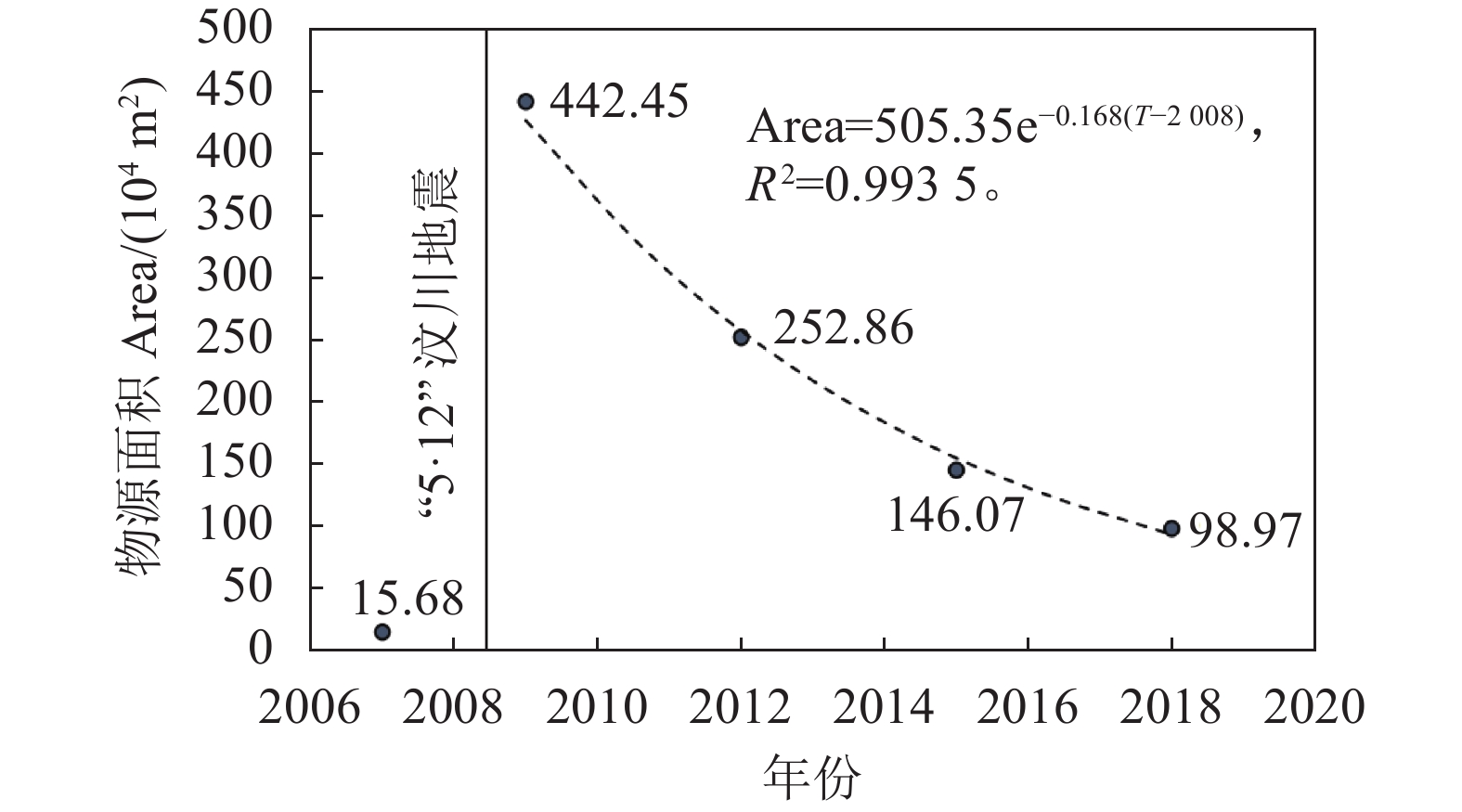 表 2 崩滑物源变化特征Table 2 Variation characteristics of landslide deposits年份 物源数量/个 物源面积/(104 m2) 相较前1期数量变化率/% 相较前1期面积变化率/% 2007 14 15.68 — — 2009 200 442.45 93.00 96.46 2012 447 252.86 55.26 42.85 2015 364 146.07 18.57 42.23 2018 148 98.97 59.34 32.24 由于降雨、植被恢复等外界条件的影响,崩滑物源数量波动较大,不能真实反映物源的演化趋势,所以,根据5期遥感影像的解译数据,选取崩滑物源面积Area为指标(因变量),年份T为自变量,探究物源的演化模式,R2为0.9935,表明拟合程度较高(图3)。如图3所示,崩滑物源面积随着时间的推移不断减少,并以指数函数的模式衰减,预测物源面积恢复到震前水平的时间约为21 a。