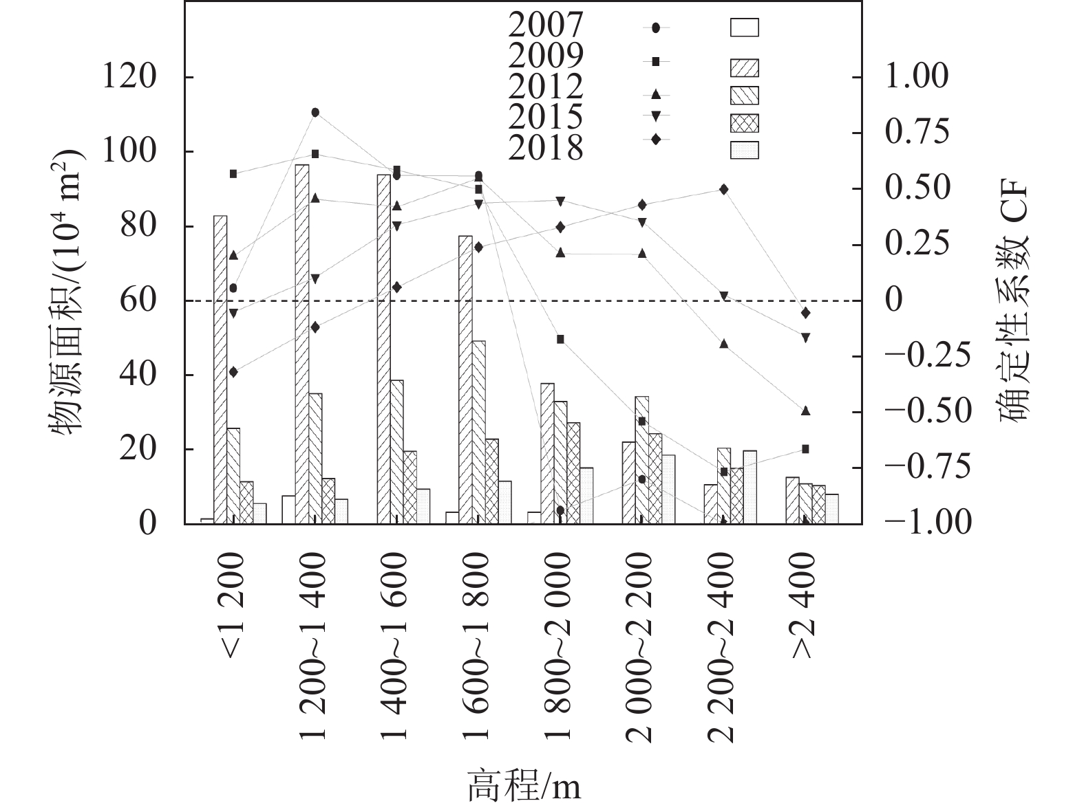 研究区高程最高为4 897 m,最低为774 m。首先,以12.5 m分辨率的数字高程模型为基础数据,根据地形条件将整个研究区高程以200 m为间隔进行分级,划分为11级;然后,将解译的5期崩滑物源图层与DEM分别进行叠加分析,对崩滑物源在高程上的分布面积进行统计,并利用确定性系数模型计算崩滑物源在各个高程区间的CF值,得到不同年份崩滑物源在高程上的空间分布特征及演化规律,结果如图4所示(点表示CF值,柱状图表示物源面积,下文同)。
