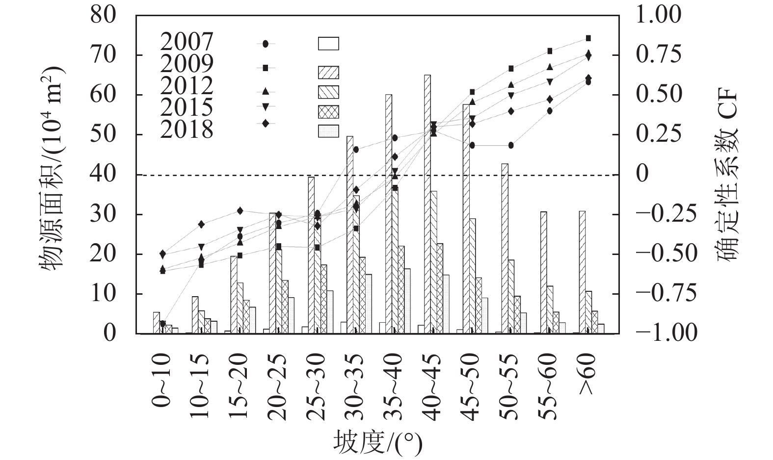 首先,根据DEM数据提取研究区的坡度,依据地形条件将整个研究区坡度以5°为间隔划分为12级,并将解译的5期崩滑物源图层与坡度分别进行叠加分析,对崩滑物源在坡度上的分布面积进行统计;利用确定性系数模型计算崩滑物源在各个坡度区间的CF值,得到不同年份崩滑物源在坡度上的空间分布特征及演化规律,结果如图5所示。