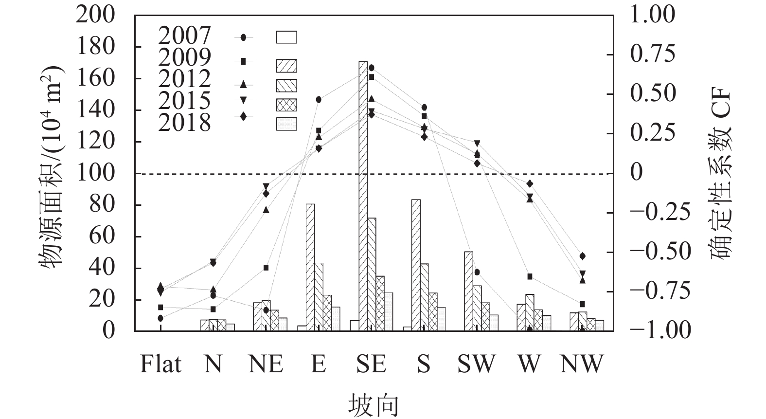 坡向对崩滑物源的分布有着重要的影响,不同坡向的斜坡受到的太阳辐射强度、降雨强度不同,导致斜坡的植被覆盖、坡向侵蚀、岩土稳定性等不同,因此不同坡向的崩滑物源变化特征不同。利用DEM数据提取出研究区的坡向,将解译的5期崩滑物源图层与坡向分别进行叠加分析,对崩滑物源在坡向上的分布面积进行统计,并利用确定性系数模型计算崩滑物源在各个坡向区间的CF值,得到不同年份崩滑物源在坡向上的空间分布特征及演化规律,结果如图6所示。