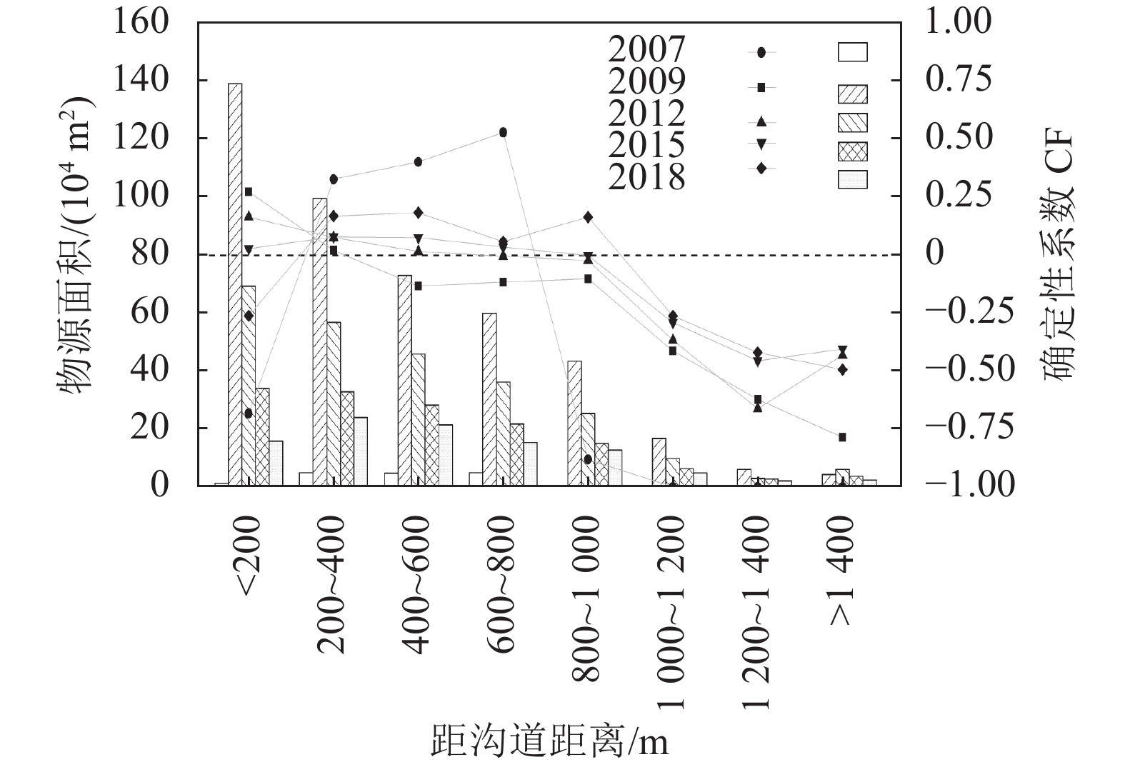 距沟道距离是崩滑物源活动的间接影响因子。利用空间分析模块下的欧氏距离工具,以200 m为间距创建流域内沟道的多环缓冲区,共分为8级,对崩滑物源在各距离范围内的分布面积进行统计,并利用确定性系数模型计算崩滑物源在各距离范围内的CF值,得到不同年份崩滑物源在距沟道距离的空间分布特征及演化规律,结果如图7所示。