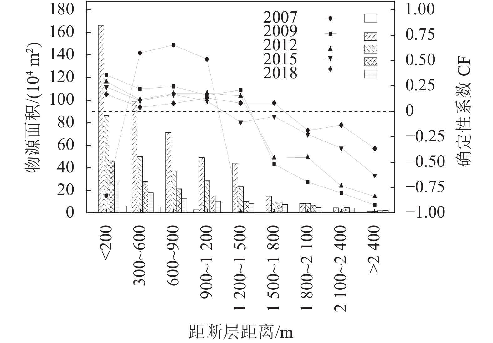 距断层距离对崩滑物源活动起间接控制作用。利用空间分析模块下的欧氏距离工具,以300 m为间距创建流域内断层的多环缓冲区,共分为9级;对崩滑物源在各距断层距离范围内的分布面积进行统计,并利用确定性系数模型计算崩滑物源在各距断层距离范围内的CF值,得到不同年份崩滑物源在距断层距离的空间分布特征及演化规律,结果如图8所示。