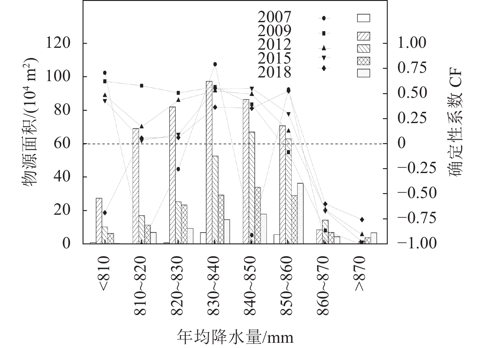 降水对崩滑物源的分布和活动有重要影响。将整个研究区年均降水量以10 mm为间隔划分为8级;将解译的5期崩滑物源图层与年均降水量分别进行叠加分析,对崩滑物源在年均降水量上的分布面积进行统计,并利用确定性系数模型计算崩滑物源在各个区间的CF值,得到不同年份崩滑物源在降水上的空间分布特征及演化规律,结果如图9所示。