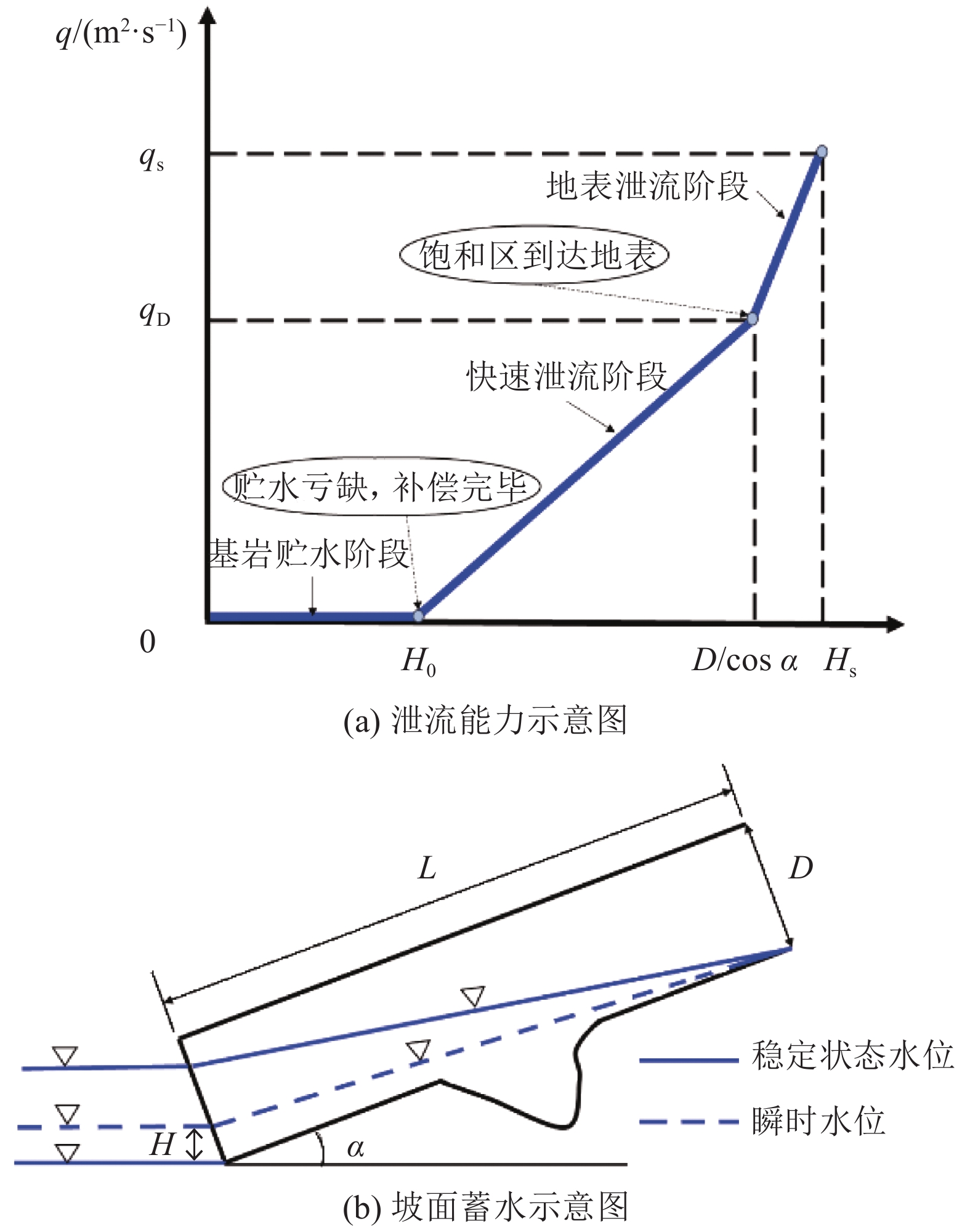 当饱和地下水面继续抬升至整个倾斜坡面全部饱和时,地下水位为Hs,暴雨壤中流的单宽排水率为qs,如图2(a)所示。