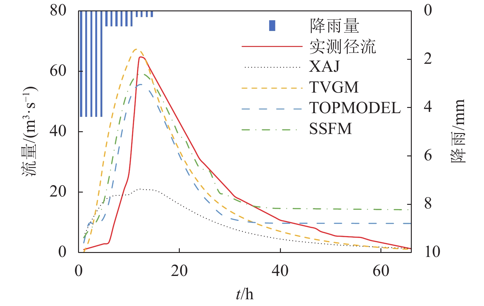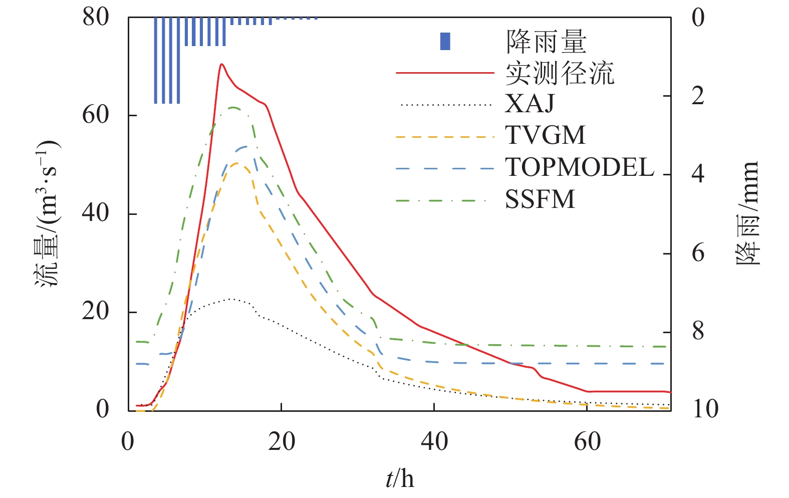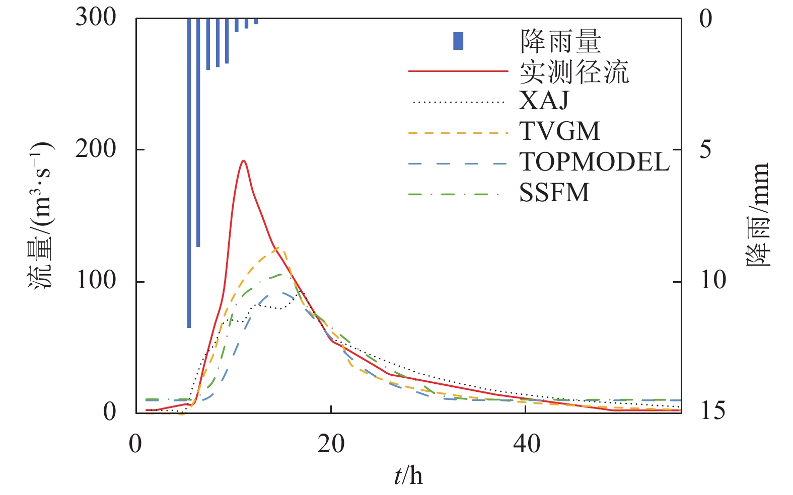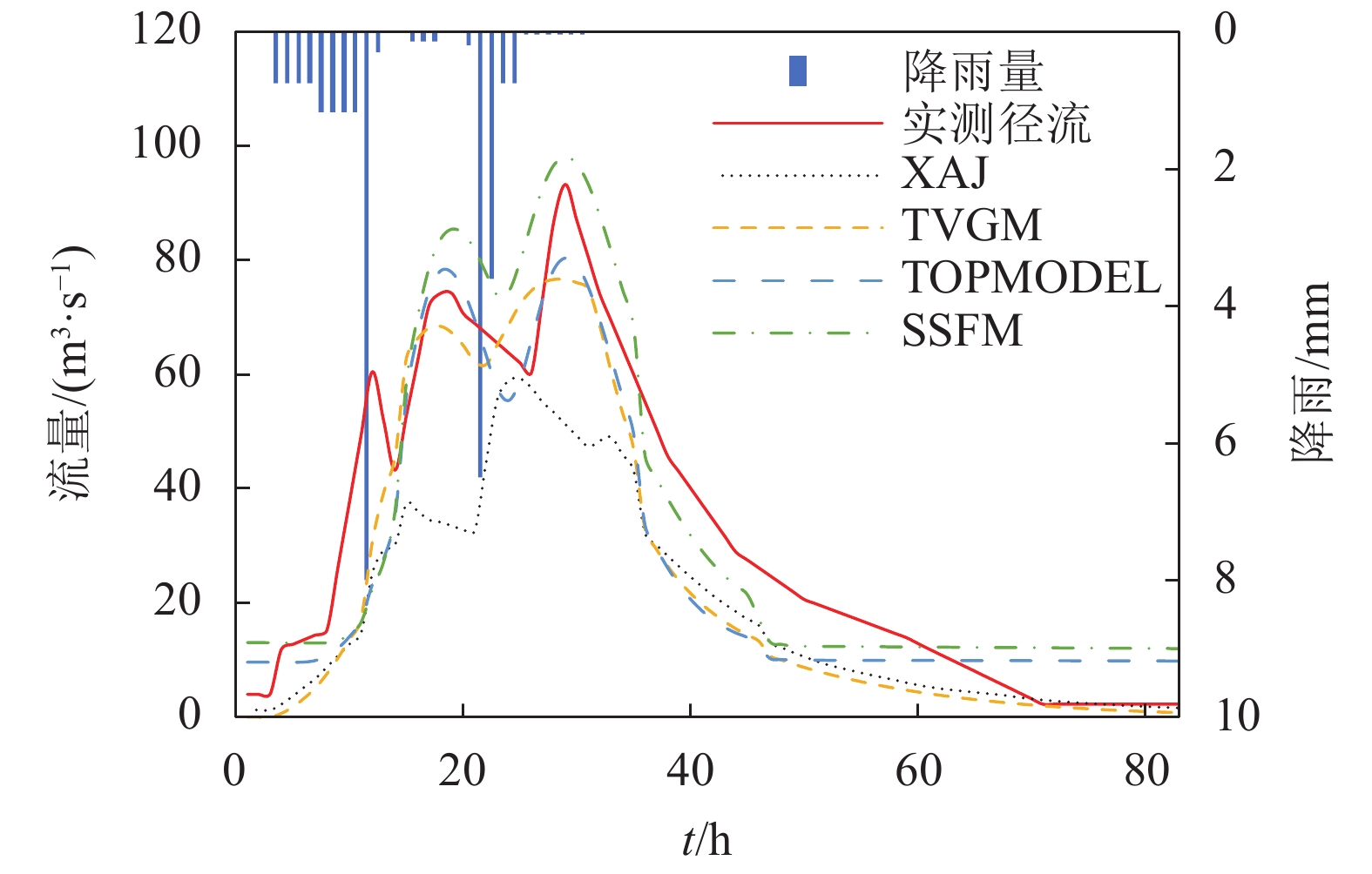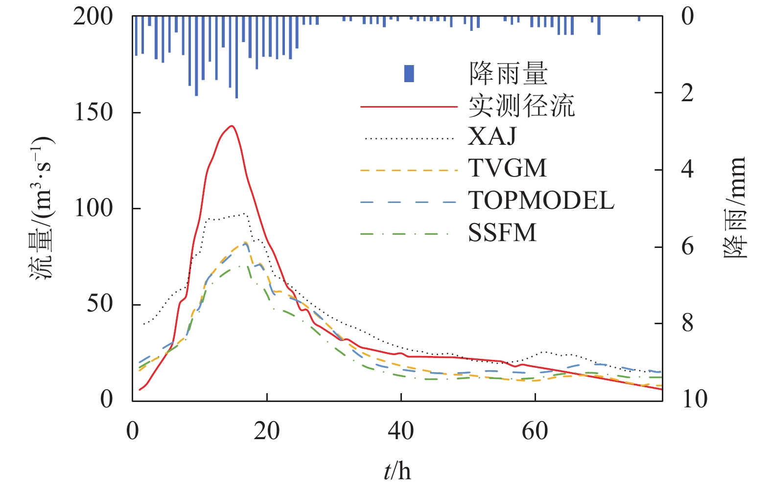 从表2中的径流深误差来看,TVGM模型、新安江模型、TOPMODEL模型、SSFM模型总体的径流深平均误差分别为–30.83%、26.87%、–18.43%、–9.67%。SSFM模型在径流深方面的模拟效果要明显优于其他3个模型。