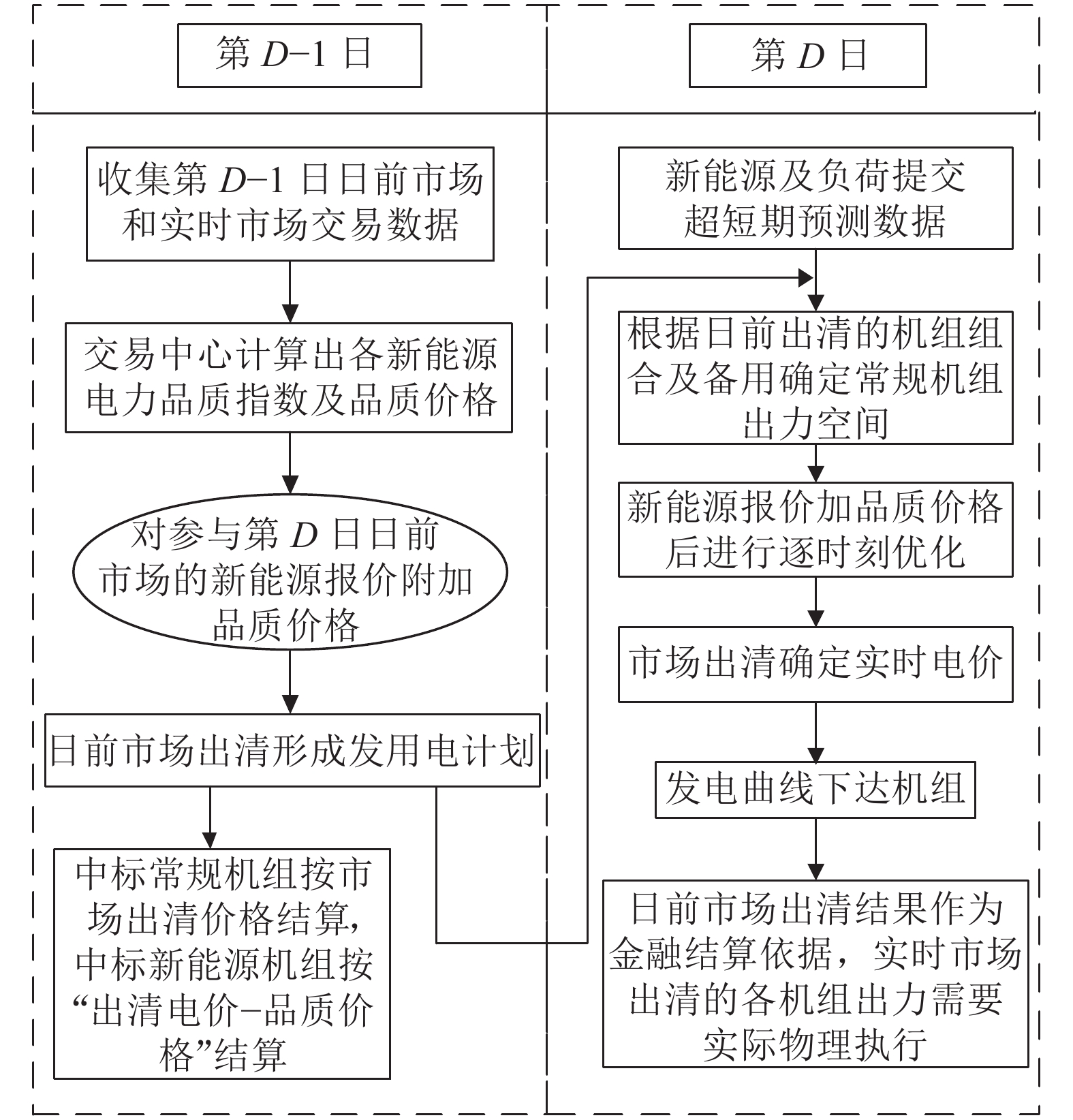 在日前市场,调度机构根据负荷预测发布电能需求和备用辅助服务需求,所有发电主体申报电能量价格及机组物理信息,同时,常规机组还需要申报正负备用价格。交易中心根据市场主体申报数据进行电能量与备用的联合优化出清,得到各机组启停状态、出力计划、备用计划、节点电价和备用价格,出清结果经安全校核后公布给各市场主体。