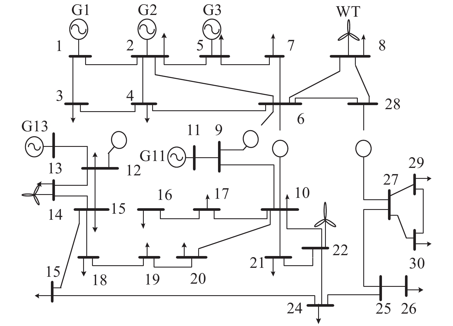为了验证本文所提新能源参与市场模式和模型的有效性,本文基于改进的IEEE 30节点系统进行验证,如图2所示。算例共设置5台常规火电机组和3台风机,详细参数见表1,并设峰时段为08:00—11:00及17:00—23:00,平时段为12:00—16:00,谷时段为24:00—07:00。