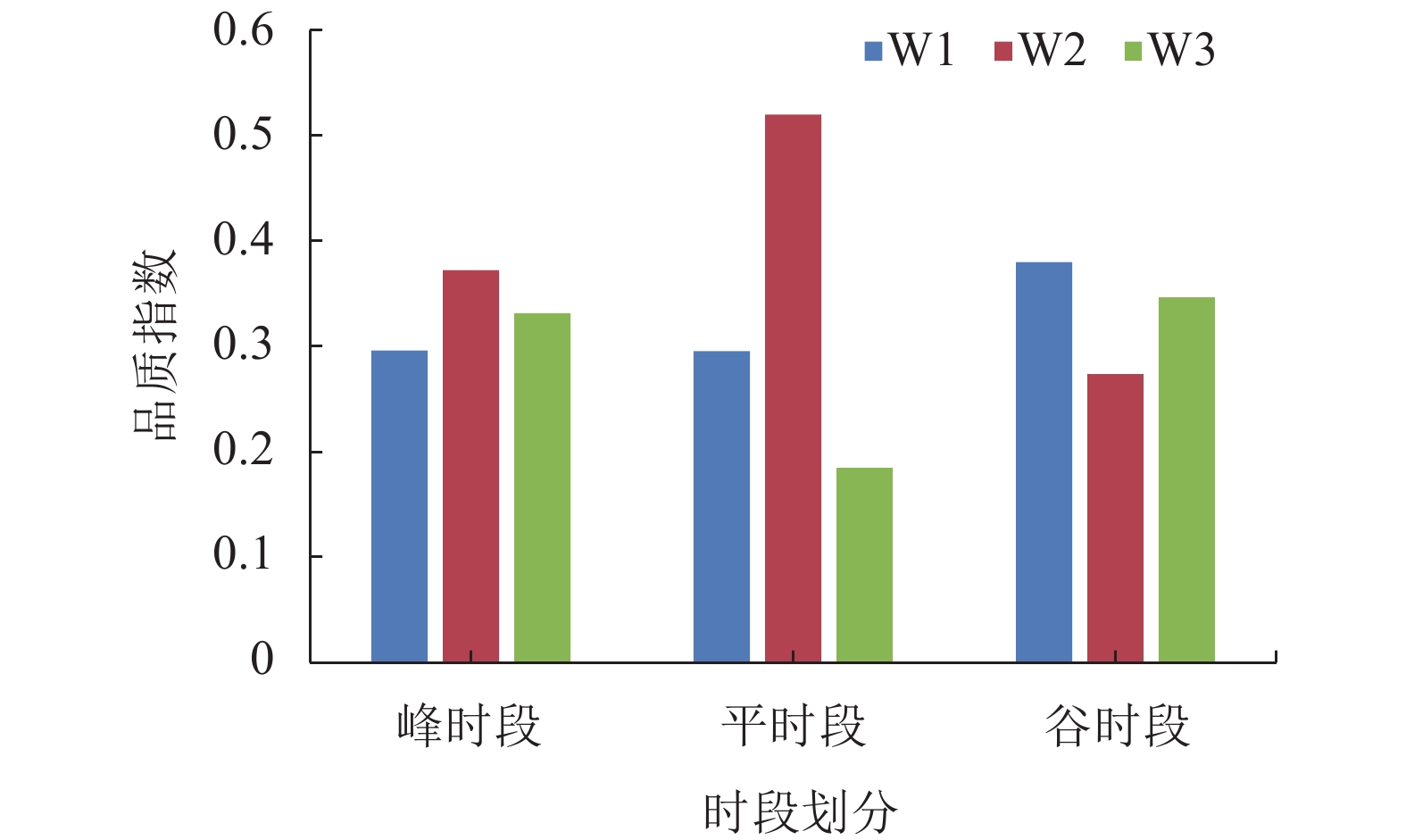由图3可以看出,在峰时段和平时段下,W2的品质最好,在谷时段下W1的电力品质最好。将不同时段下的风电品质指数结合D–1日的系统平衡成本进行分摊,得到用于D日市场交易时各风电的附加品质价格如表3所示。