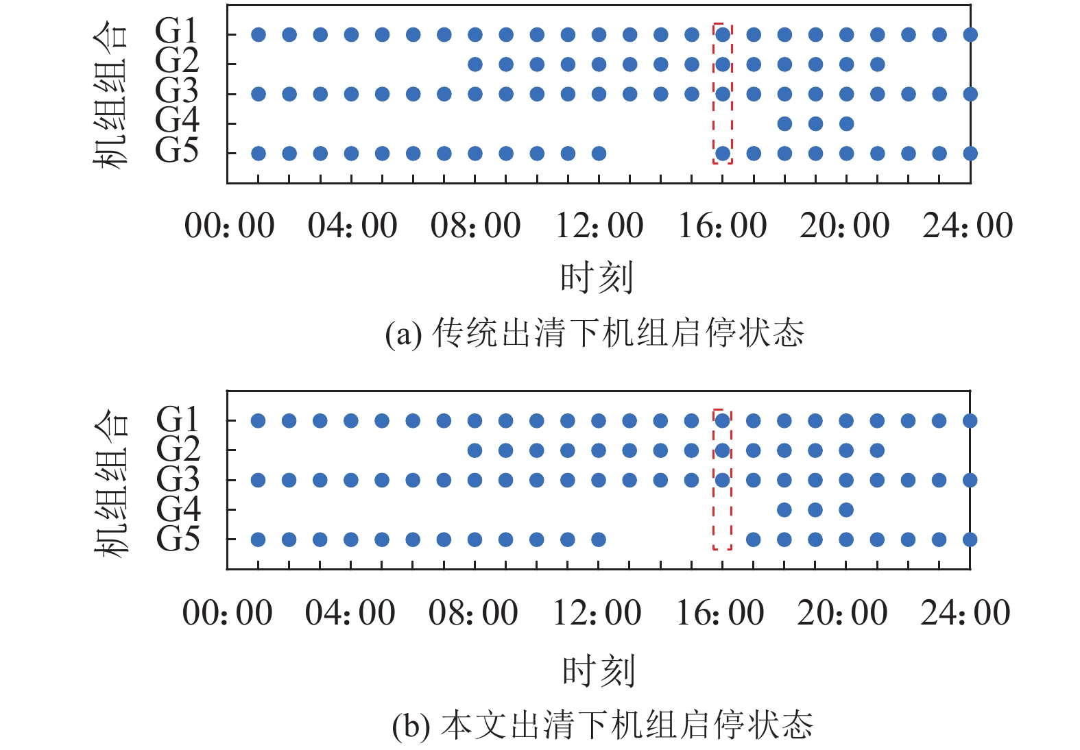 通过对比传统出清模式和本文所提附加品质价格后出清两种不同模式下的中标结果,可以发现在常规机组的启停状态上有所不同,如图4所示。从图4可以看出:当对风电机组附加电力品质价格后,两种出清方式下的机组启停状态在16:00发生变化,如图4中虚线对比所示;相比于传统出清结果,本文所提出清模式下G5机组在17:00才开机运行。