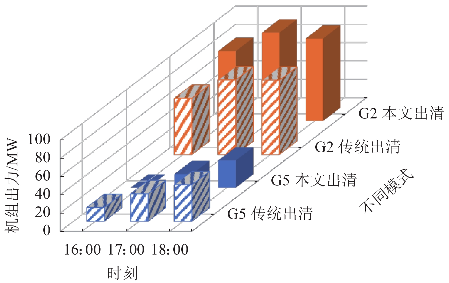 由于在16:00时G5机组的启停状态不同,因此后续各机组的中标电量也发生改变,如图5所示。从图5可以看出:G1、G3因备用中标量或出力限值影响未产生较大变化,后续时刻中标量改变主要发生在G2和G5。在16:00,本文出清模式下G5未开机,G1边际发电成本最低,G2最高,G1受预留正备用容量限值达到最大出力,G3处于满发状态。相较于传统出清下的负备用由G3获得,本文出清下由价格更低的G2中标,因而G2在预留负备用容量外获得更多发电量。在16:00后,G5开机,其边际发电成本最低可以中标更多电量,但受爬坡率限制,只能逐渐增发电量直到满发状态。