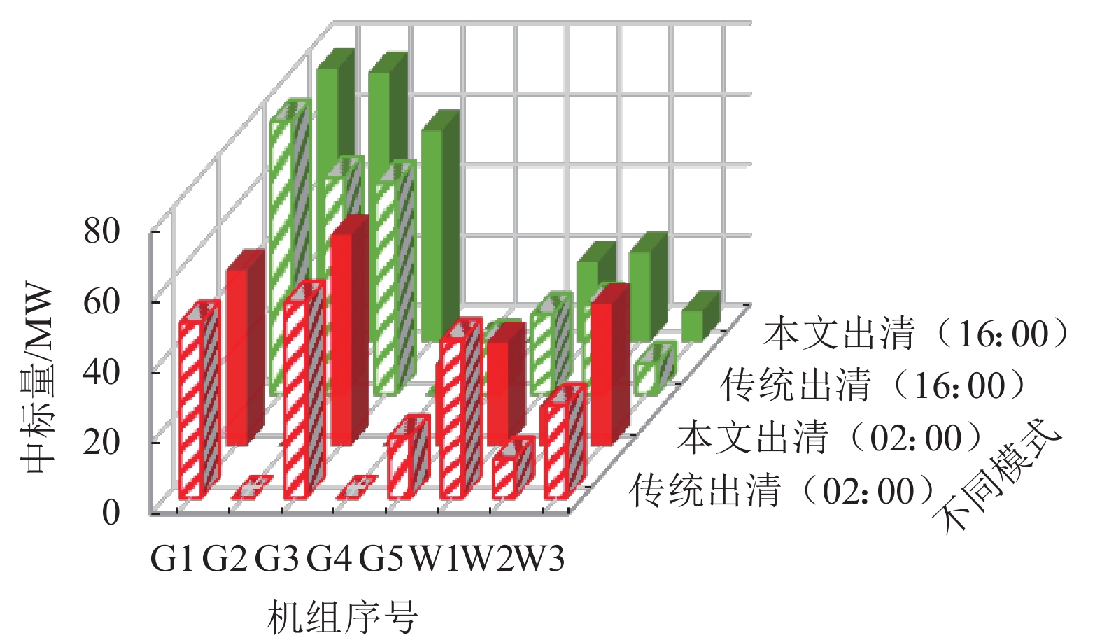 以谷时段02:00和平时段16:00为例,分析附加品质价格对机组中标排序的影响。图6为两种出清模式下各机组中标电量对比情况。