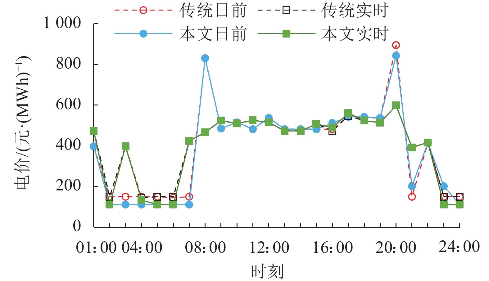 表 4 传统出清与本文出清下电价对比Table 4 Comparison of electricity price between traditional clearing and improved clearing出清方式 日前平均电价/