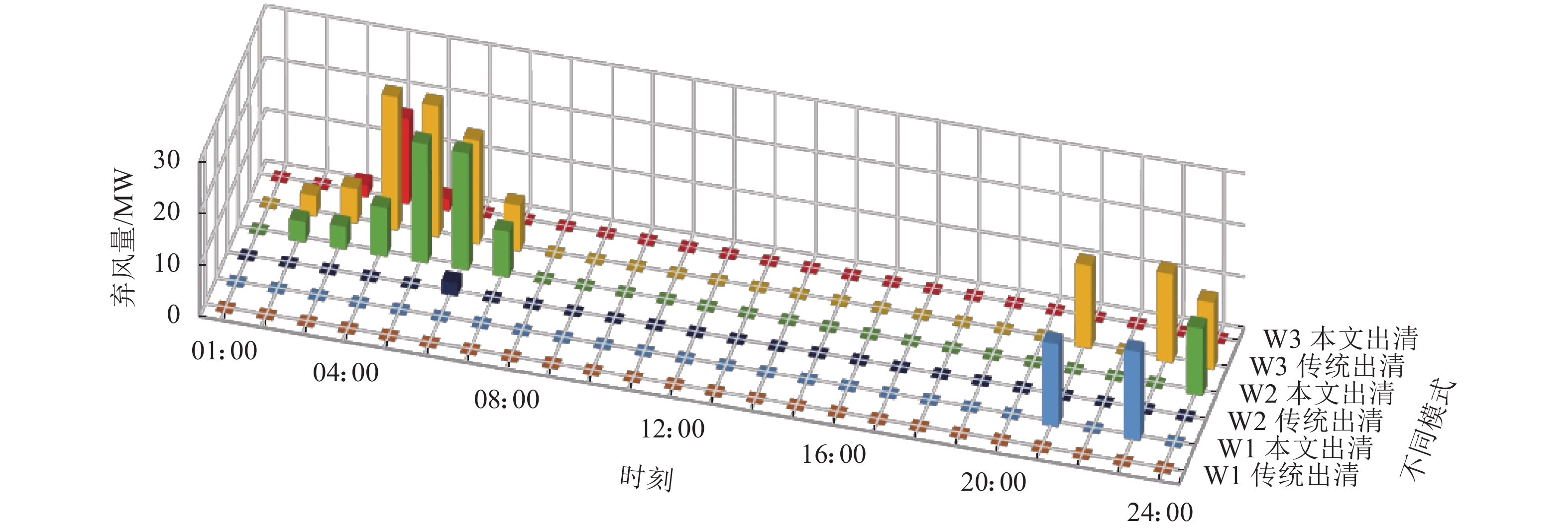 表 5 传统出清与本文出清下系统成本对比Table 5 Comparison of system cost between traditional clearing and improved clearing出清方式 日前购电成本/元 系统平衡成本/元 总结算成本/元 传统出清 2 787 619.374 5 124.681 688 2 792 744.056 本文出清 2 787 564.904 −7 268.138 195 2 780 296.804 通过图8可以发现:谷时段W1优先消纳,传统出清下弃风最多为W3,本文出清下弃风最多为W2,因为W2品质最差,附加品质价格后价格最高。在峰平时段不存在弃风,这是因为该时段负荷较大,附加品质价格后的风电机组报价仍低于常规火电,因此风电基本全额消纳。在21:00和23:00存在弃风,这是由于风电发电量增加,火电机组在预留备用后已处于最低出力,系统调节资源不足所导致。综上,本文提出的附加电力品质价格出清的方式使得风电等新能源之间的竞争更加公平。