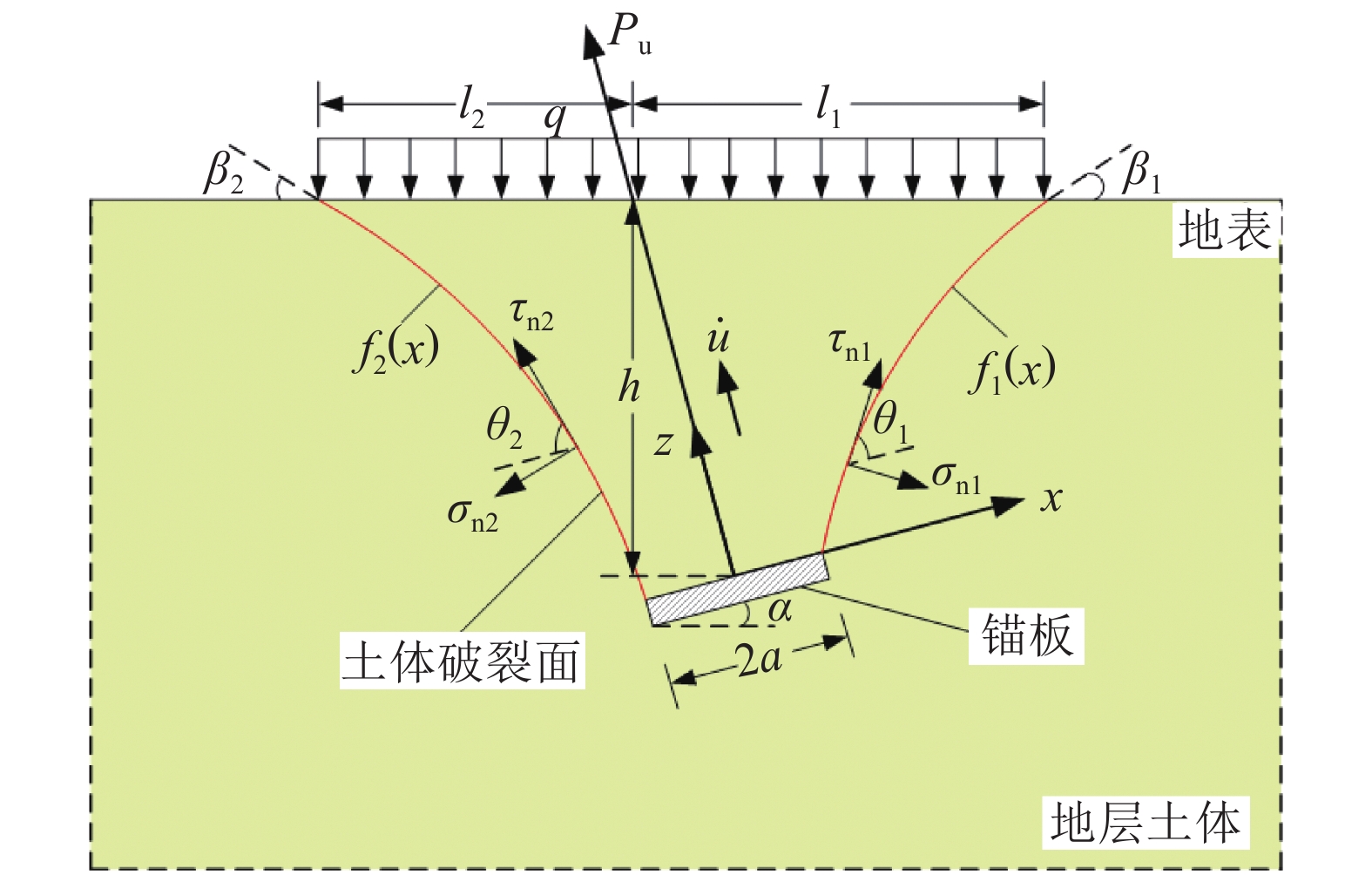 $ \alpha $ 的浅埋倾斜条形锚板的土体非对称破坏机制,如图1所示。图1中:锚板宽度为$ 2a $ ,承受的极限抗拔力为$ {P_{\text{u}}} $ ,在极限上拔荷载作用下,锚板与上方土体共同以速度$ \dot u $ 沿斜拉方向产生上拔破坏;同时,锚板上拔破坏还受到地面超载$ q $ 影响;以平行于锚板方向为$ x $ 轴,垂直于锚板方向为$ z $ 轴,对应的右侧土体破裂面曲线为$ {f_1}\left( x \right) $ ,左侧土体破裂面曲线为$ {f_2}\left( x \right) $ ;右侧、左侧破裂曲线与地表之间夹角分别为$\; {\beta _1} $ 、$ \;{\beta _2} $ ,对应的破裂宽度分别为$ {l_1} $ 、$ {l_2} $ ;$ {\tau _{{\text{n1}}}} $ 、$ {\sigma _{{\text{n}}1}} $ 为右侧土体破裂面任一点处的剪应力、正应力,$ {\tau _{{\text{n}}2}} $ 、$ {\sigma _{{\text{n2}}}} $ 为左侧土体破裂面任一点处的剪应力、正应力。已有研究结果表明[1-4],地层土体被破坏时对应的强度包络线更接近一外凸曲线,而非传统Mohr–Coulomb破坏准则定义的线性关系。因此,本文采用非线性Mohr–Coulomb破坏准则来定义地层土体的强度破坏特性,如式(1)所示。目前,该种非线性准则已在土层抗拔基础、边坡和隧道等问题分析[24-28]中得到了广泛应用。