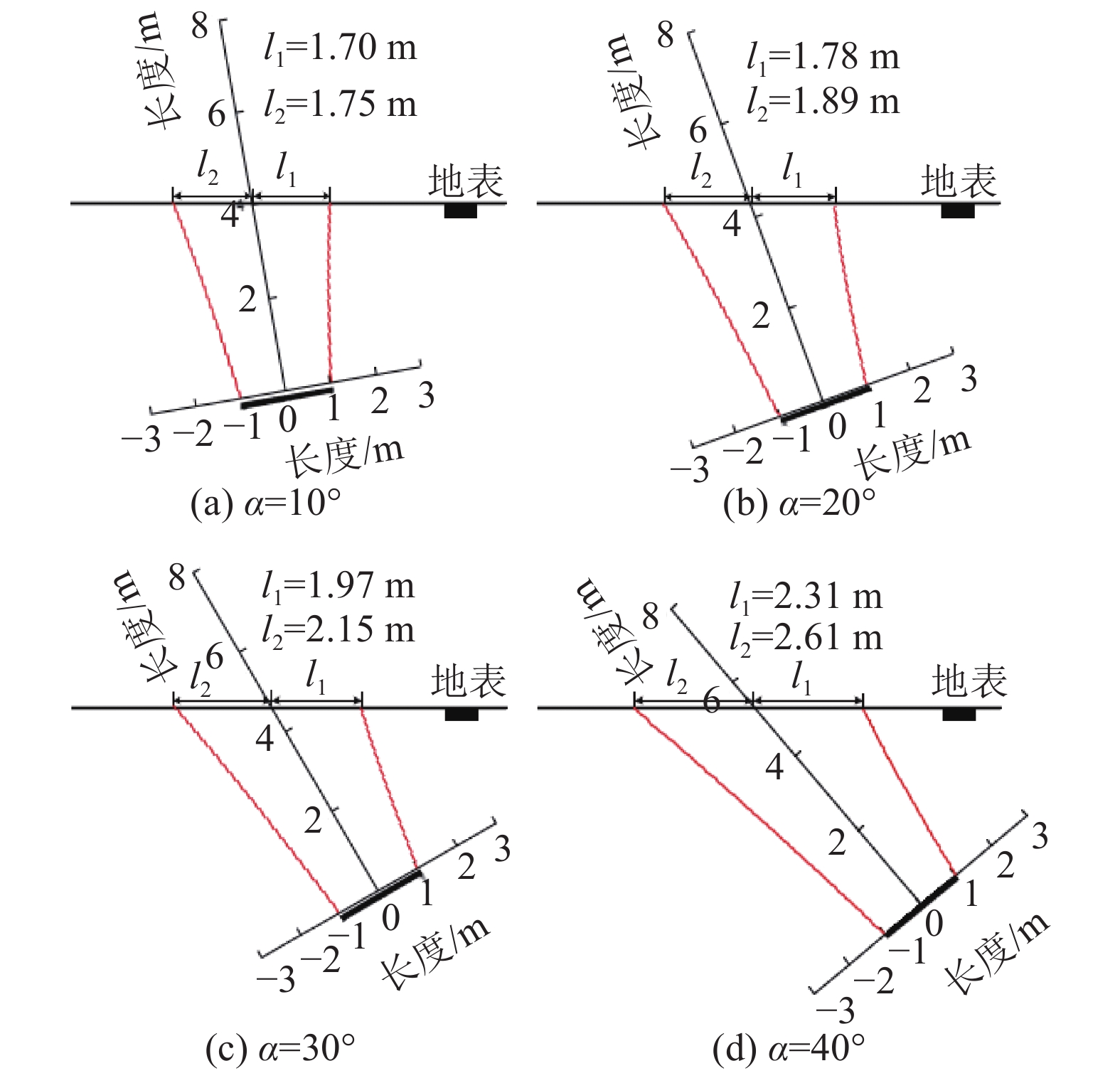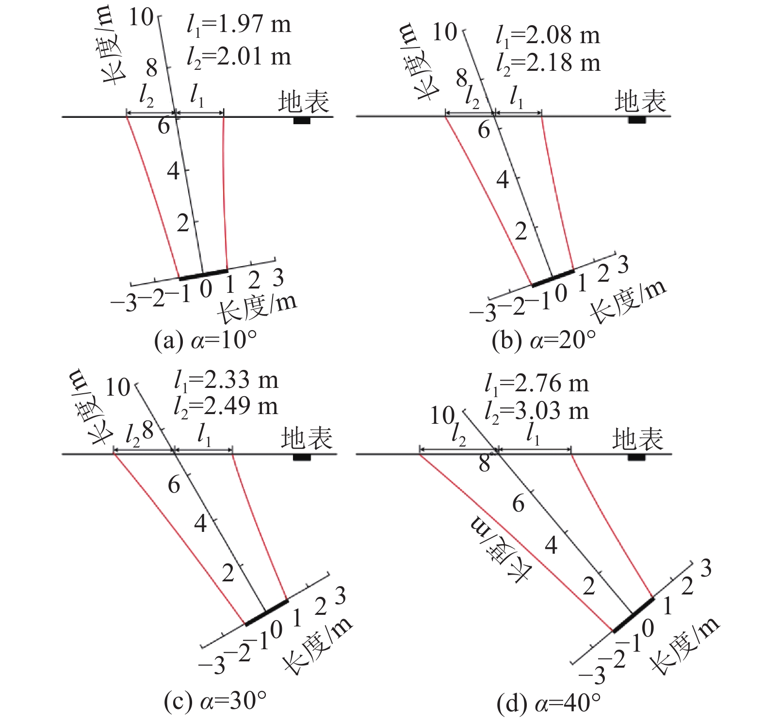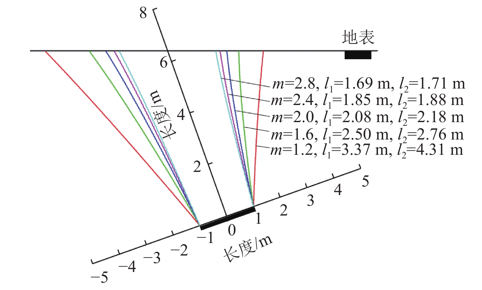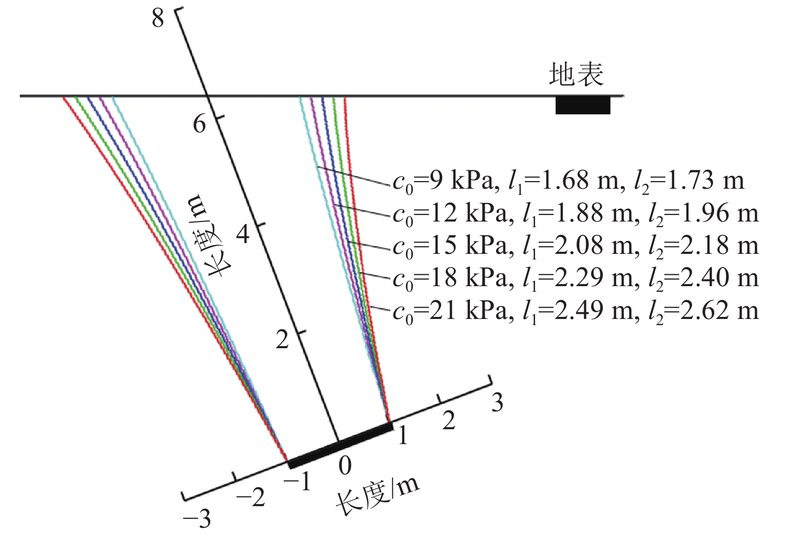 $$ C = {\left[ {\tan {\beta _2}{{\left( {m{\sigma _{\text{t}}}} \right)}^{ - 1}}c_0^m} \right]^{1/\left( {m - 1} \right)}} + \gamma {l_2}{\cos ^2}\;\alpha $$ (41) $$ D = {\sigma _{\text{t}}}c_0^{ - m}{\left( {\gamma \cos\; \alpha } \right)^{ - 1}}{\left( {C - \gamma a\cos\; \alpha } \right)^m} $$ (42) 同时,得到关于l2的如下隐式方程: