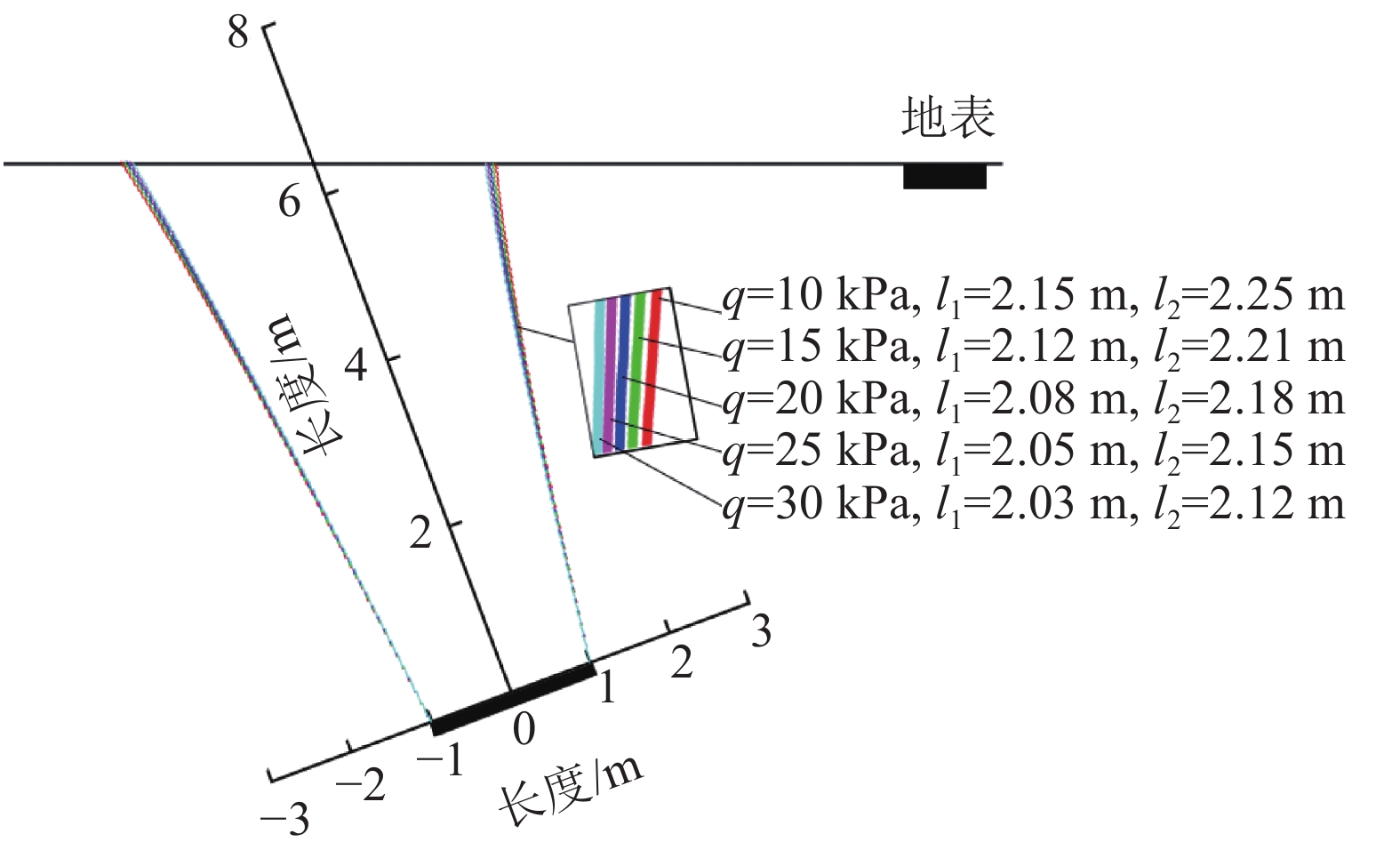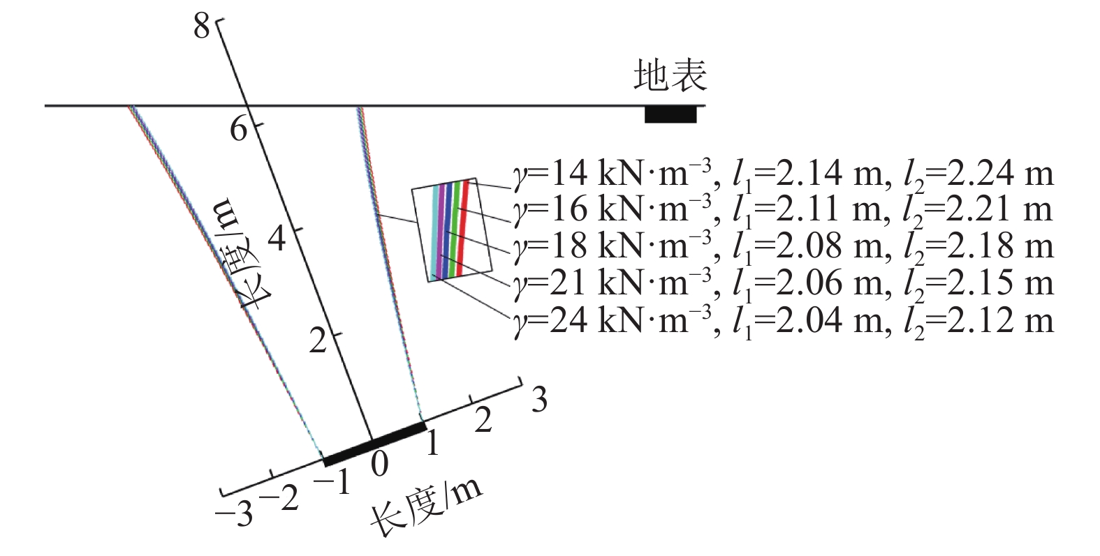 $ {\dot W_\gamma } $ 为:$$ \begin{aligned}[b] {{\dot W}_\gamma } =& - \Bigg[ {\left( {h{l_1} + h{l_2} + \frac{{\text{1}}}{4}l_2^2\sin 2\alpha - \frac{{\text{1}}}{4}l_1^2\sin 2\alpha } \right) - } \\& {\int_a^{{l_1}\cos\; \alpha } {{f_1}\left( x \right)} {\text{d}}x - \int_{ - {l_2}\cos\; \alpha }^{ - a} {{f_2}\left( x \right){\text{d}}x} } \Bigg] \cdot \gamma \dot u\cos \;\alpha \end{aligned} $$ (18) 地表超载