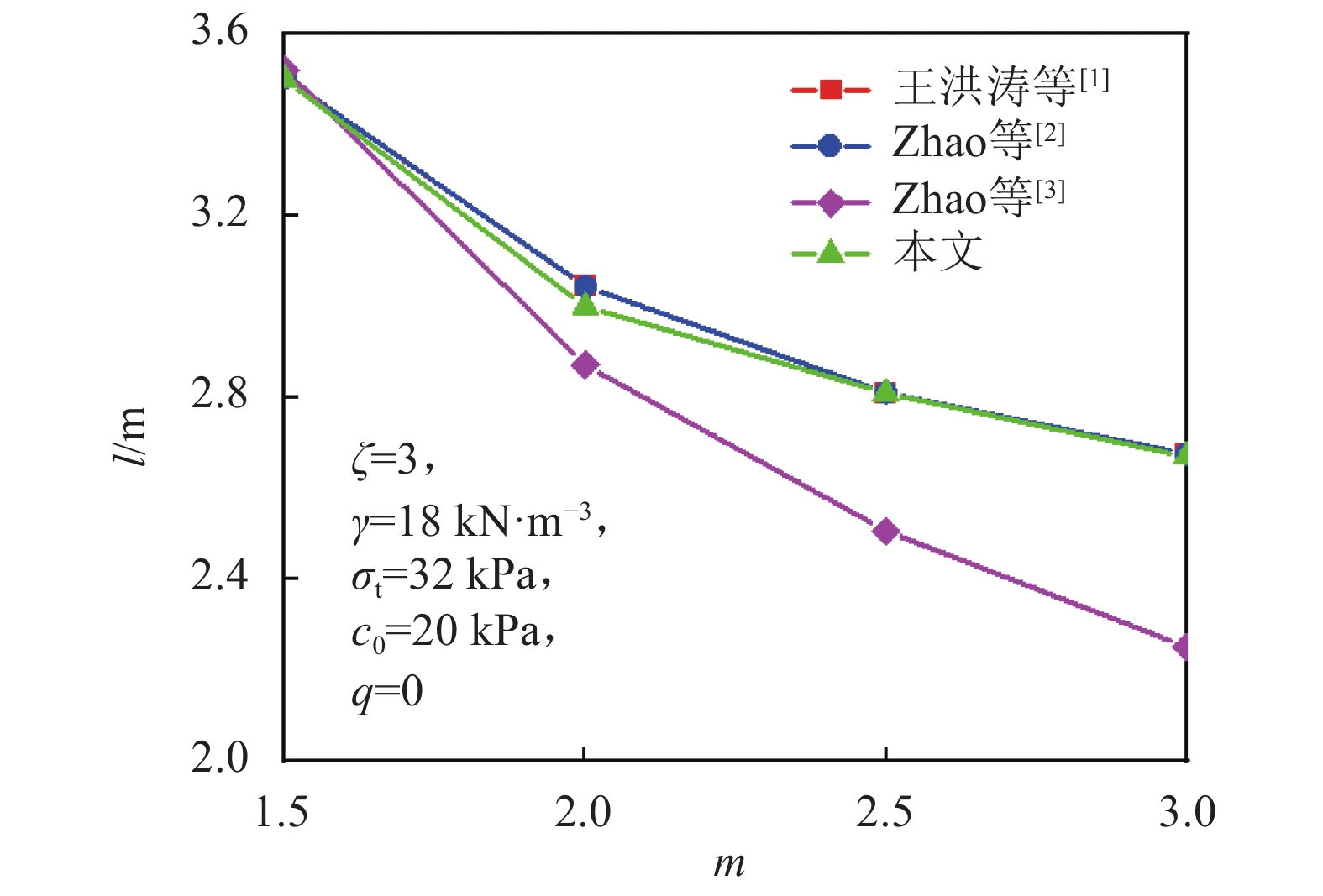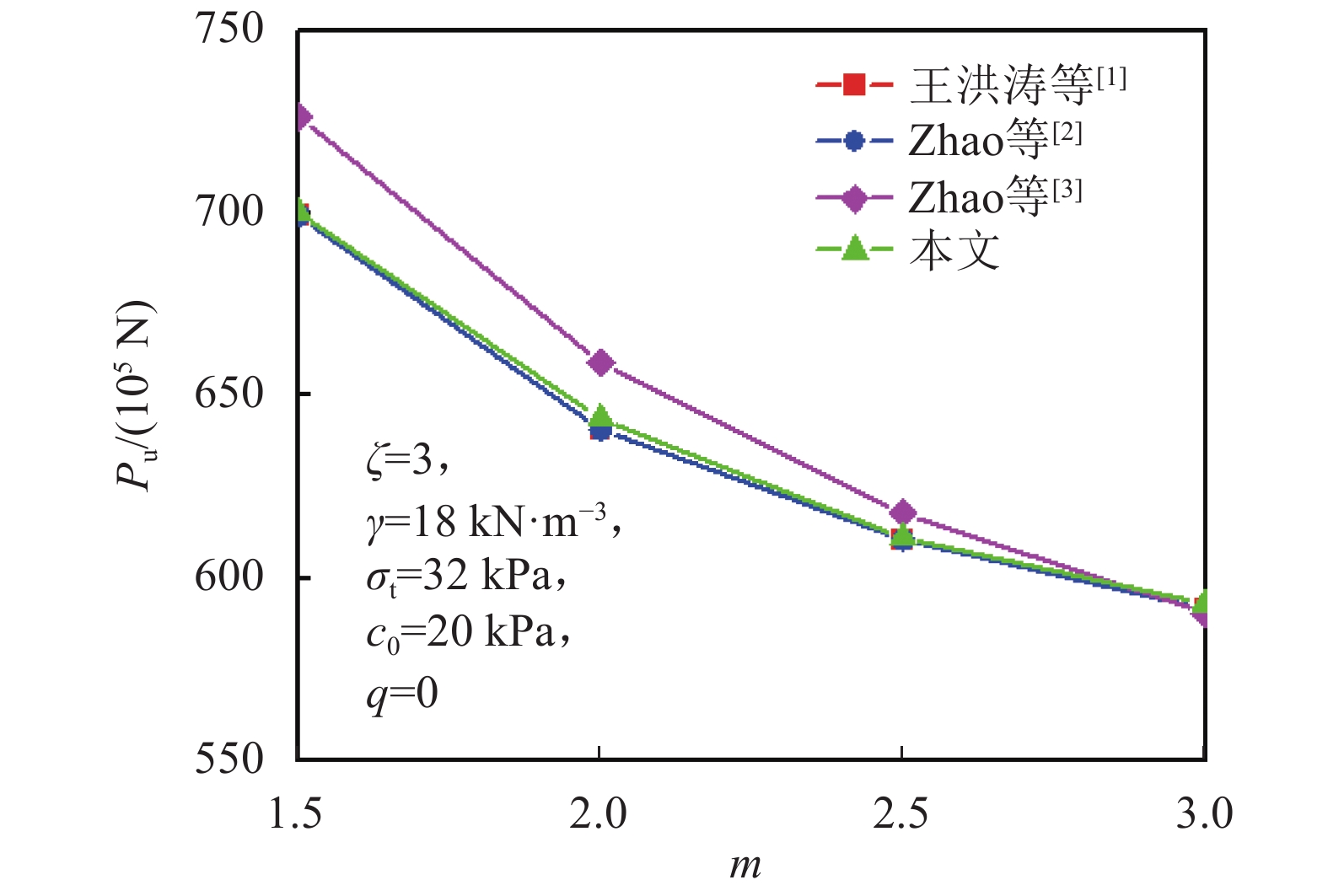 为验证本文提出方法的有效性,令锚板倾角α=0°,并假设地层均质,则图1破坏机制即可转化为文献[1-3]中对应的破坏机制,图13和14为不同计算方法下锚板极限抗拔力与土体破裂范围随非线性系数m的变化曲线。从图13~14可以看出,相同参数条件下,不同计算方法对应的锚板极限抗拔力与土体破裂范围变化规律一致,均呈现随非线性系数增大而减小的趋势。而且,本文计算求得的极限抗拔力与土体破裂范围值与文献[1]和[2]的结果非常接近,最大相差仅为0.5%;但与文献[3]相比,本文求得的极限抗拔力偏小(最大相差26.53 kN),土体破裂范围值偏小(最大相差0.42 m),这均验证了本文方法的有效性。
