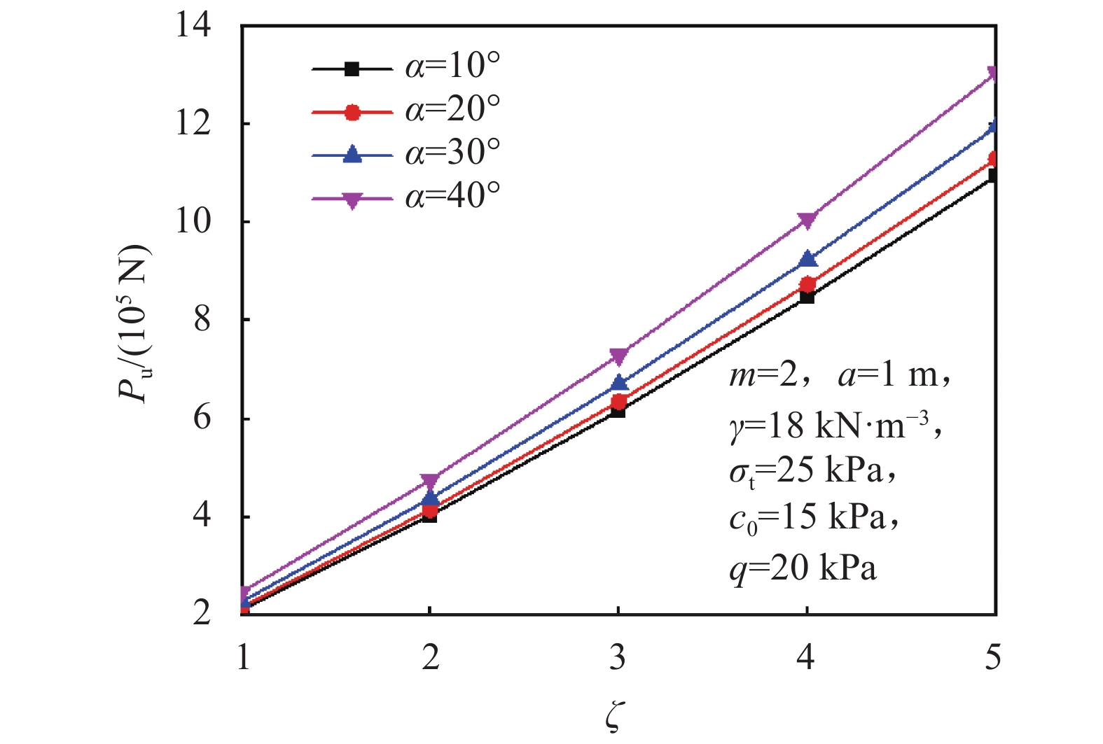 $ {P_{\text{u}}} $ 的参数众多。为更好地指导锚板基础设计及施工,分析不同力学参数对锚板极限抗拔力的影响规律;同时,为便于分析讨论,定义锚板埋深比ζ=h/2a。当锚板倾角α=10°、20°、30°、40°时,不同力学参数对极限抗拔力Pu的影响规律曲线如图3~5所示。3.1.1 不同埋深的影响