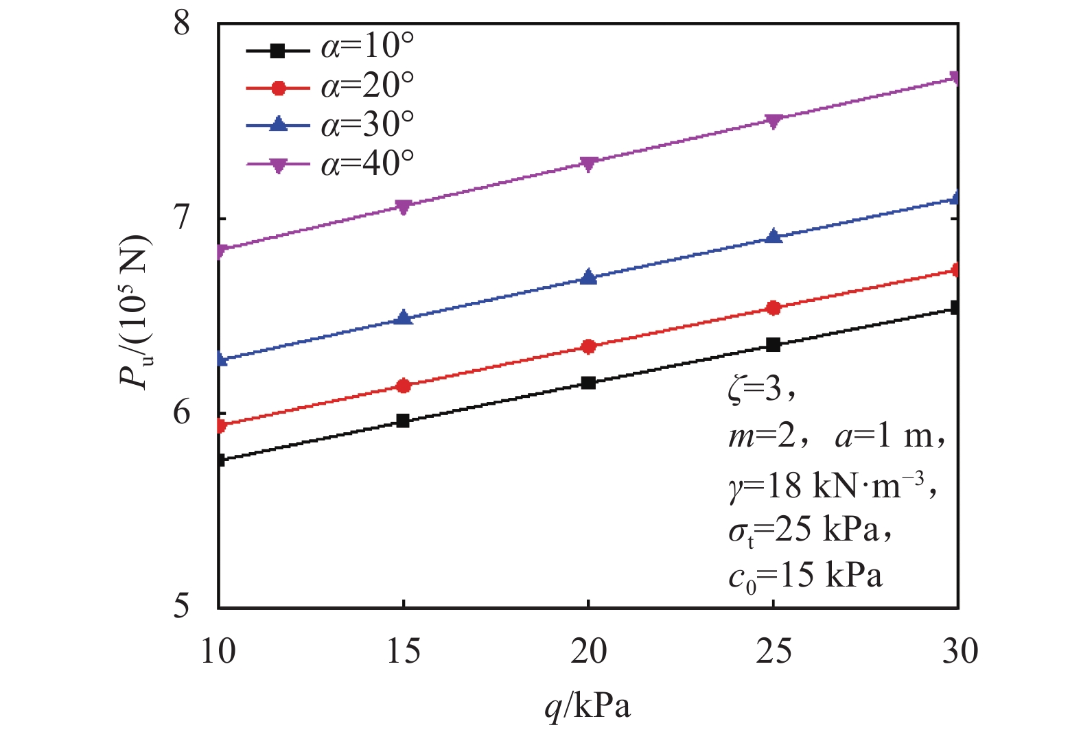 当埋深比ζ=3时,锚板极限抗拔力Pu随不同地面超载q的变化曲线如图5所示。由图5可以看出:Pu随q增加而不断增大;当q相同时,α越大,Pu也越大。因此,在实际工程中,为获得较优的承载效果,可在地表处设置一定堆载来提高锚板基础承载能力。