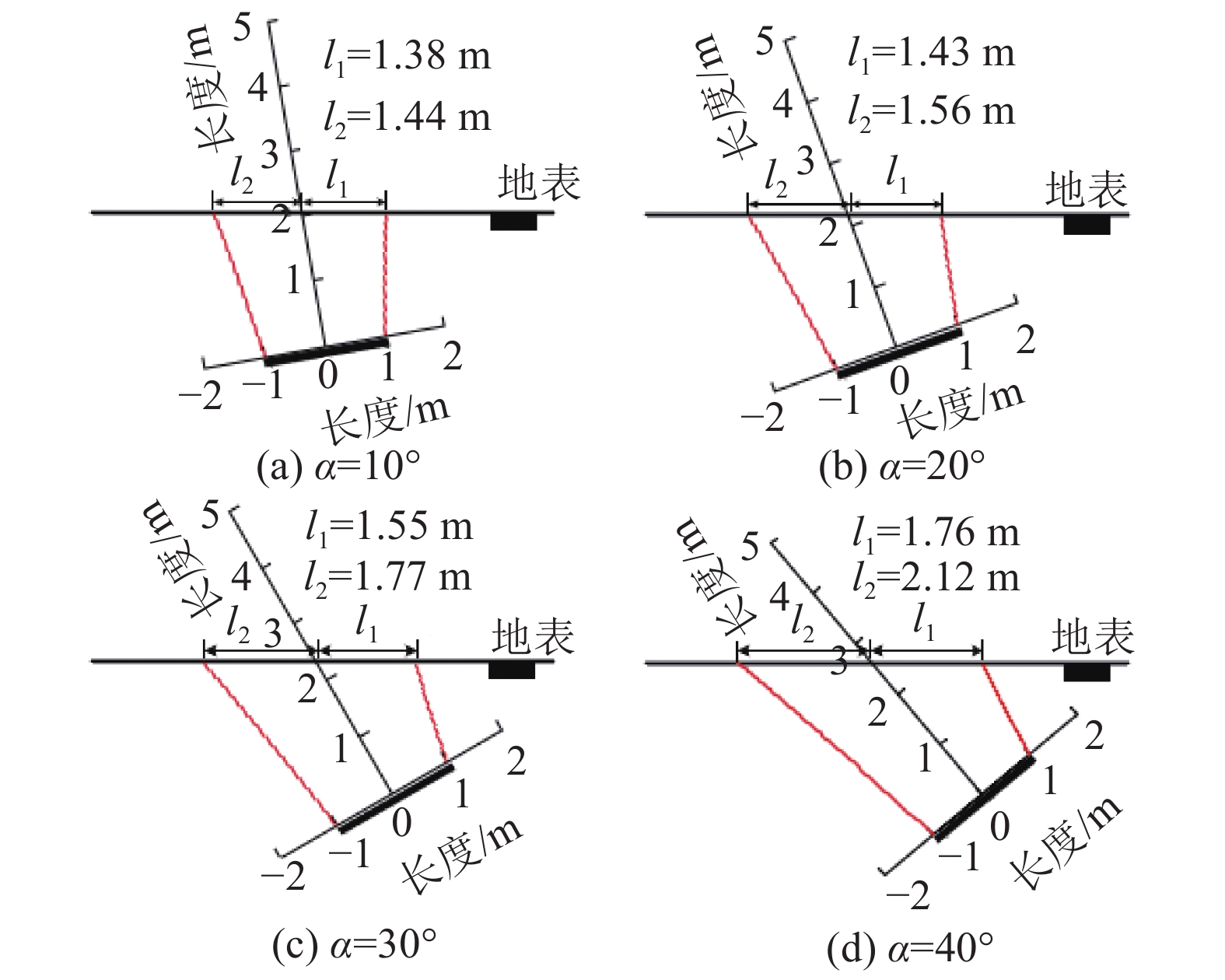 $ {f_2}\left( x \right) $ ,则满足如下边界条件:$${\qquad {f_2}^\prime \left( {x = - {l_2}\cos\; \alpha } \right) = - \tan\; {\beta _2}} $$ (38) $$ {f_2}\left( {x = - a} \right) = 0 $$ (39) $$ {f_2}\left( {x = - {l_2}\cos\; \alpha } \right) = \frac{h}{{\cos\; \alpha }} + {l_2}\sin\; \alpha $$ (40) 联立式(30)、(31)、(38)、(39)、(40),求得积分常数C、D分别为: