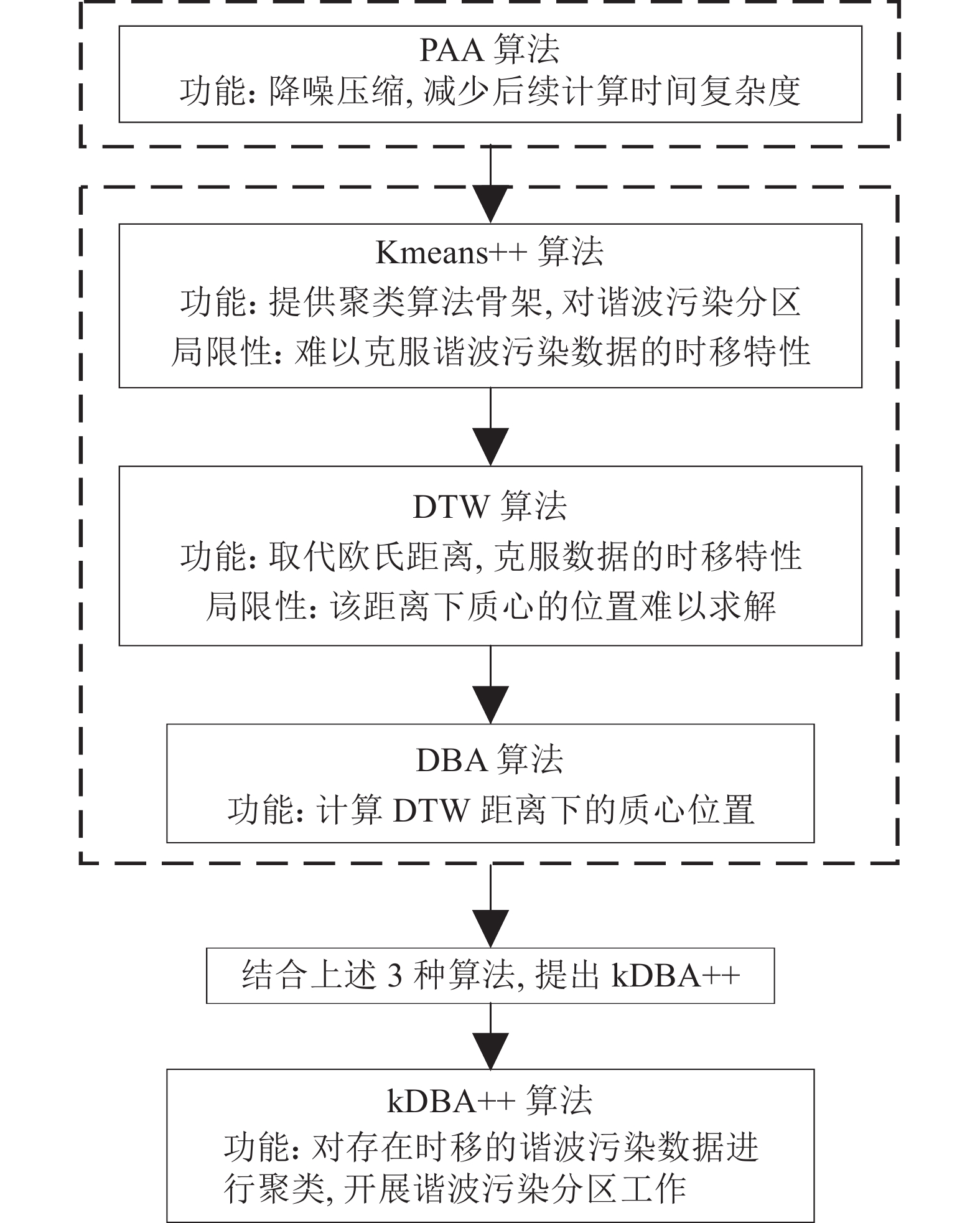 本质上,谐波污染分区是一个聚类问题,其对象具有高维度、含噪声、时移性等特点,传统方法求解困难。为此,本文综合考虑了PAA、kmeans++、DTW、DBA各自特点,由此改进提出kDBA++算法,改进思路如图1所示。该算法各部分具体介绍见第2.1~2.5节。