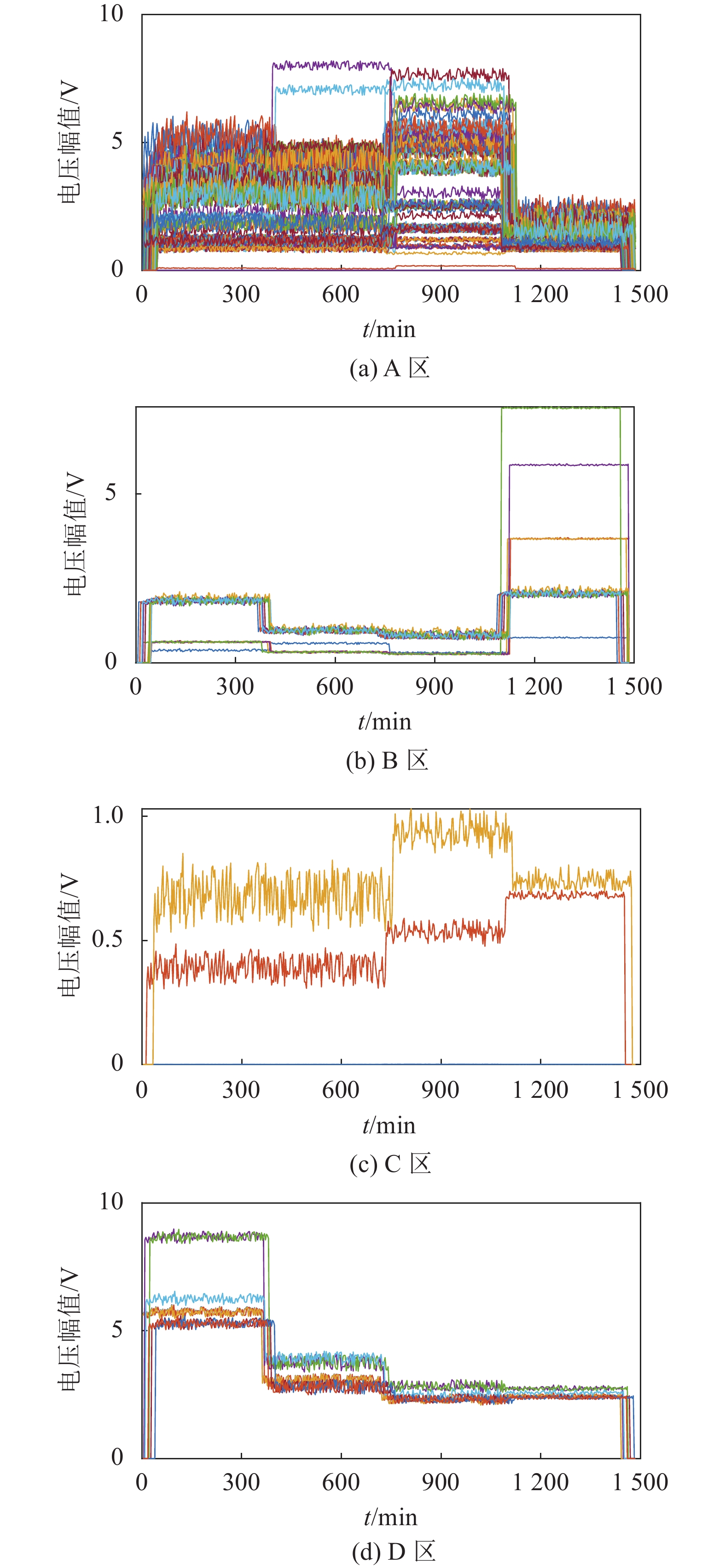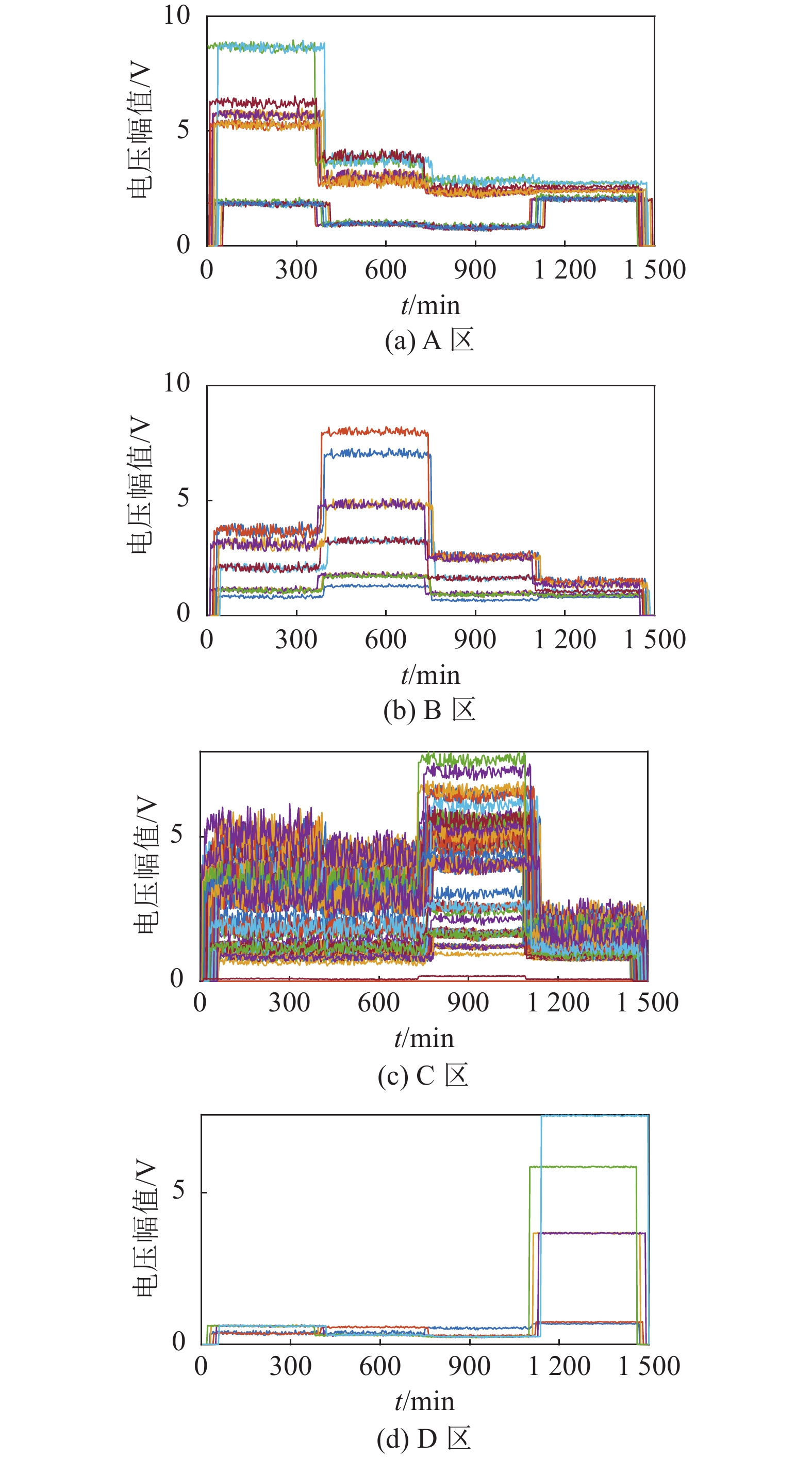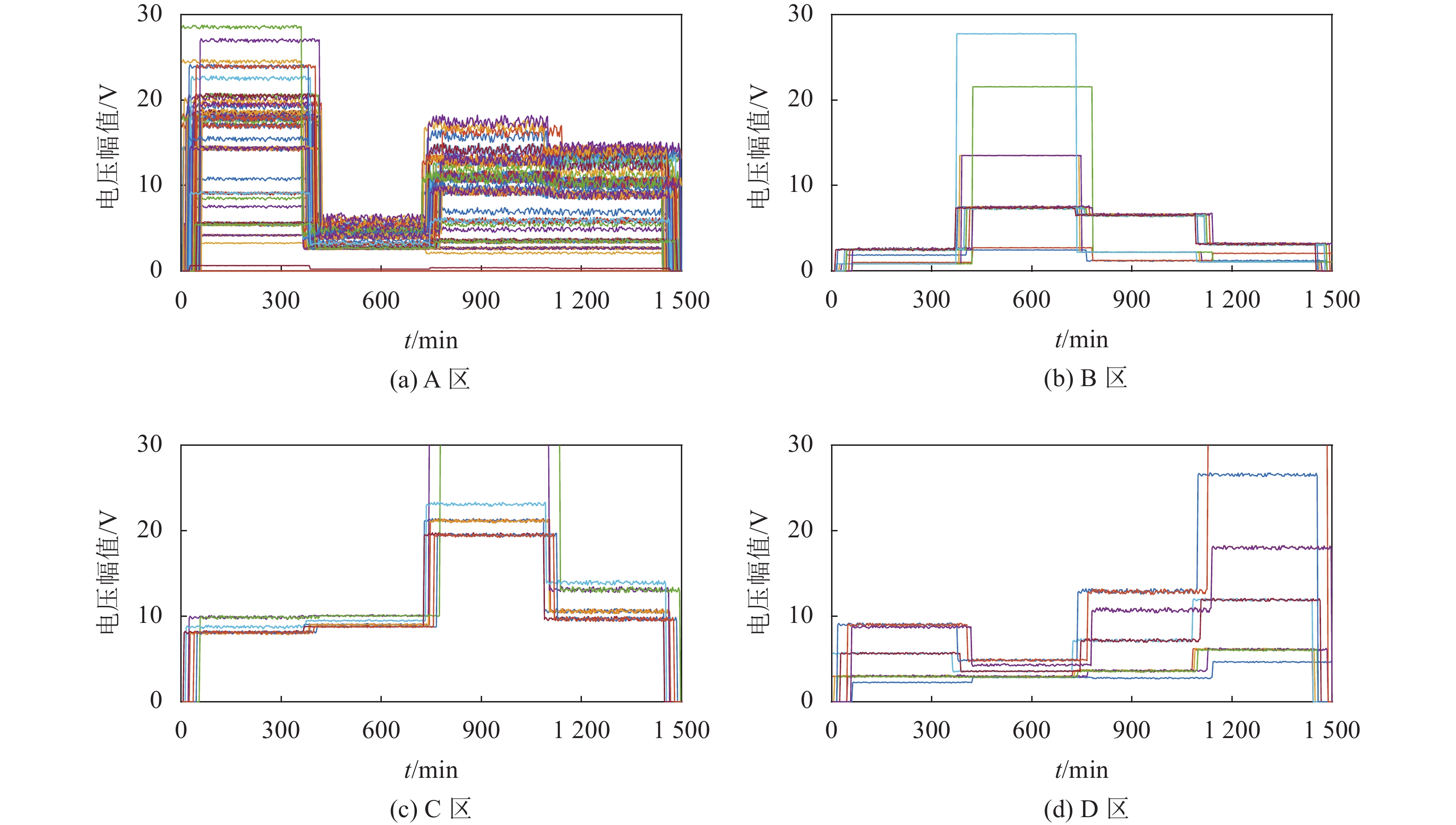 图12 中4幅子图中共计245条曲线,分别代表245个节点。该数目远超真实样本数量(132),表明结果中一点多区现象严重。且由图12可见,每一分区内均波形杂乱。同时,Silhouette系数仅为0.232 9,难以满足实际工程需求,因此可认为该算法实际效果欠佳。