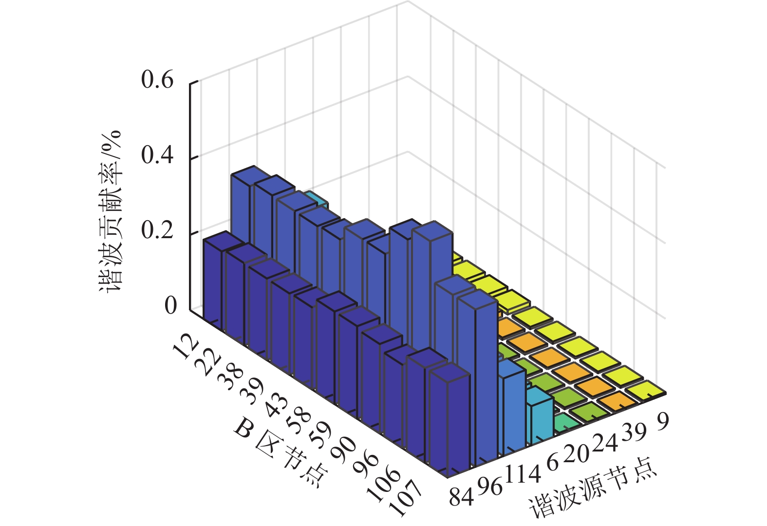 为进一步验证kDBA++算法求得谐波污染分区的正确性,以分区B为例,采用文献[34]所提谐波贡献度计算方法,分析8个谐波源对B区中11个非谐波源节点的谐波电压贡献度如图14所示。图14中,每一柱形均代表了不同谐波源节点对B区内部非谐波源节点的谐波电压贡献度。可见,B区内主导节点96对该区所有非谐波源节点的谐波贡献度最大,相比之下,其他谐波源贡献度明显较小,从而再次论证了分区结果的准确性。其他3区情况与B区类似。因此,当网络中某一母线3次谐波电压含量超标时,只需在该母线所在区域内搜索可疑谐波源,就可大大缩小主导谐波源追溯范围。