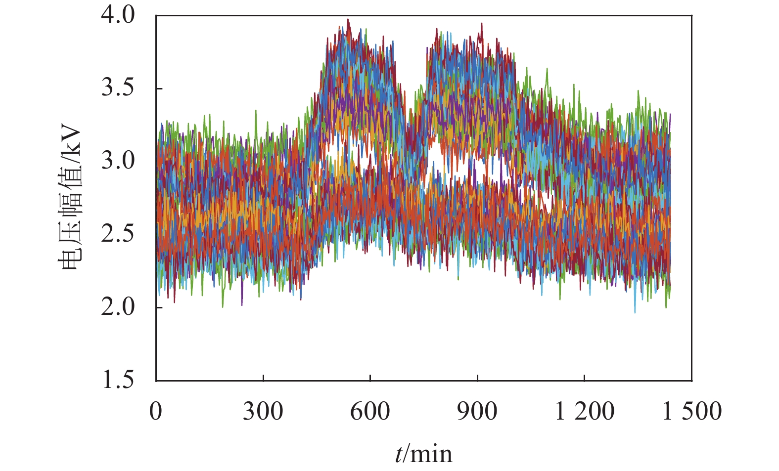 表 2 不同区域节点间转移阻抗Table 2 Transfer impedance between nodes in different regions p.u.节点 C区 B区 40 47 48 49 50 51 22 38 39 43 C区 40 1.44 1.43 1.43 1.43 1.43 1.43 0.44 0.52 0.52 0.57 47 1.43 1.83 1.83 1.82 1.82 1.82 0.44 0.51 0.51 0.63 48 1.43 1.83 1.83 1.82 1.82 1.82 0.44 0.51 0.51 0.63 49 1.43 1.82 1.82 1.97 1.97 1.97 0.44 0.51 0.51 0.63 50 1.43 1.82 1.82 1.97 2.11 2.11 0.44 0.51 0.51 0.63 51 1.43 1.82 1.82 1.97 2.11 2.25 0.44 0.51 0.51 0.62 B区 22 0.44 0.44 0.44 0.44 0.44 0.44 1.71 1.12 1.12 1.11 38 0.52 0.51 0.51 0.51 0.51 0.51 1.12 1.89 1.89 1.32 39 0.52 0.51 0.51 0.51 0.51 0.51 1.12 1.89 1.89 1.32 43 0.57 0.63 0.63 0.63 0.63 0.63 1.11 1.32 1.32 1.96 考虑到实际电网中存在其他频次谐波,故基于5次谐波污染仿真数据,再次进行验证。该频次谐波污染同样由[84,96,114,6,20, 24,39,9]8个谐波源引起,前4个谐波源电流幅值较大,起主导作用,后4个电流幅值较小,以模拟背景谐波。5次谐波电压数据共计1 440组,如图15所示。图15中132条曲线对应系统内132个节点。