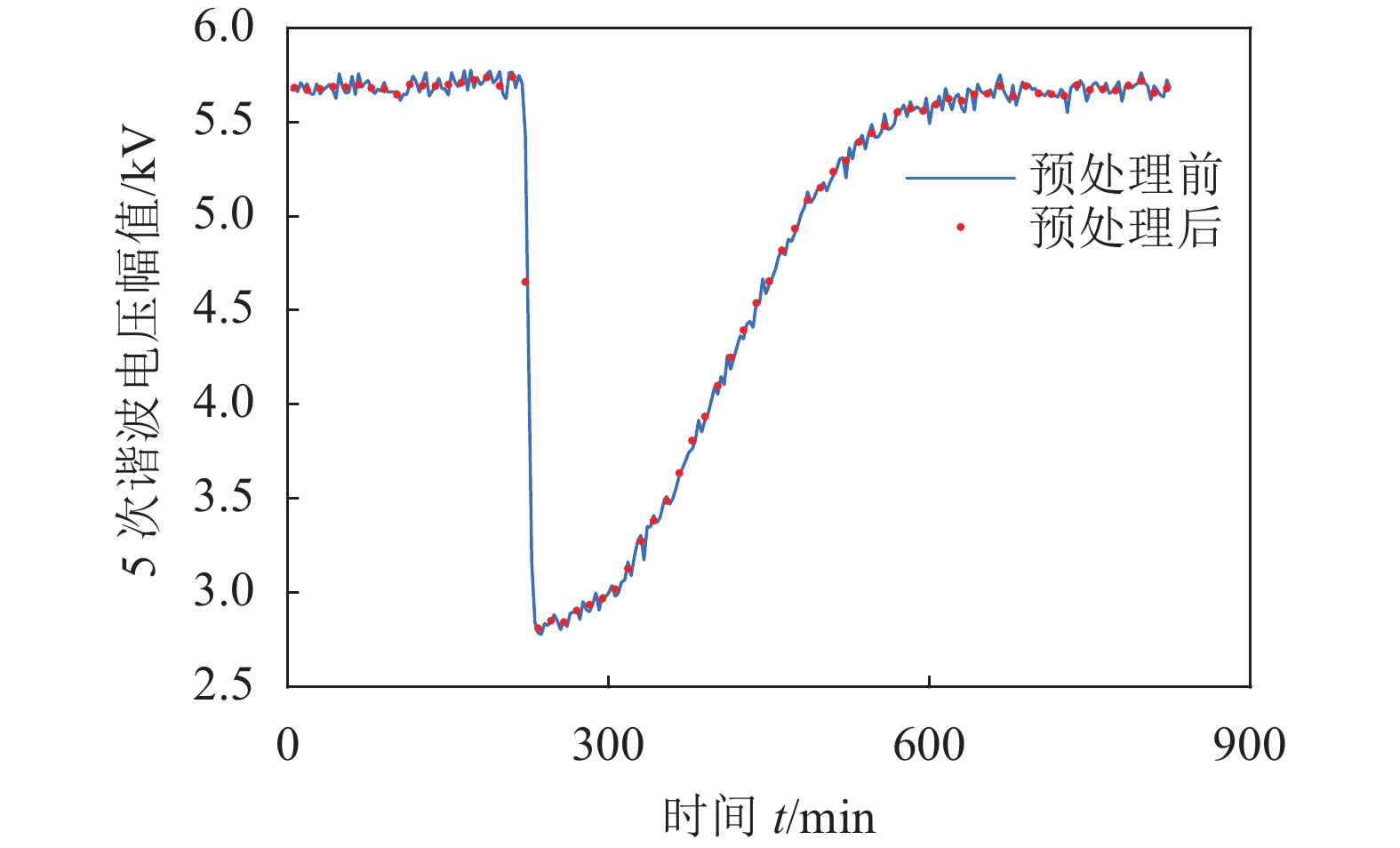$ \omega $ 为时间窗口宽度,$ v{'_j} $ 为预处理后的第j个监测数据。PAA压缩降噪处理后的数据记为$ {\boldsymbol{v}}' $ ,如式(3)所示,其长度为n,有$ n \lt m $ 。$$ {\boldsymbol{v}}' = [{v'_1},{v'_2}, \cdots ,{v'_j}, \cdots ,{v'_n}] $$ (3) 基于PAA算法,某地3次谐波电压幅值时序数据压缩效果如图2所示(时间窗口宽度