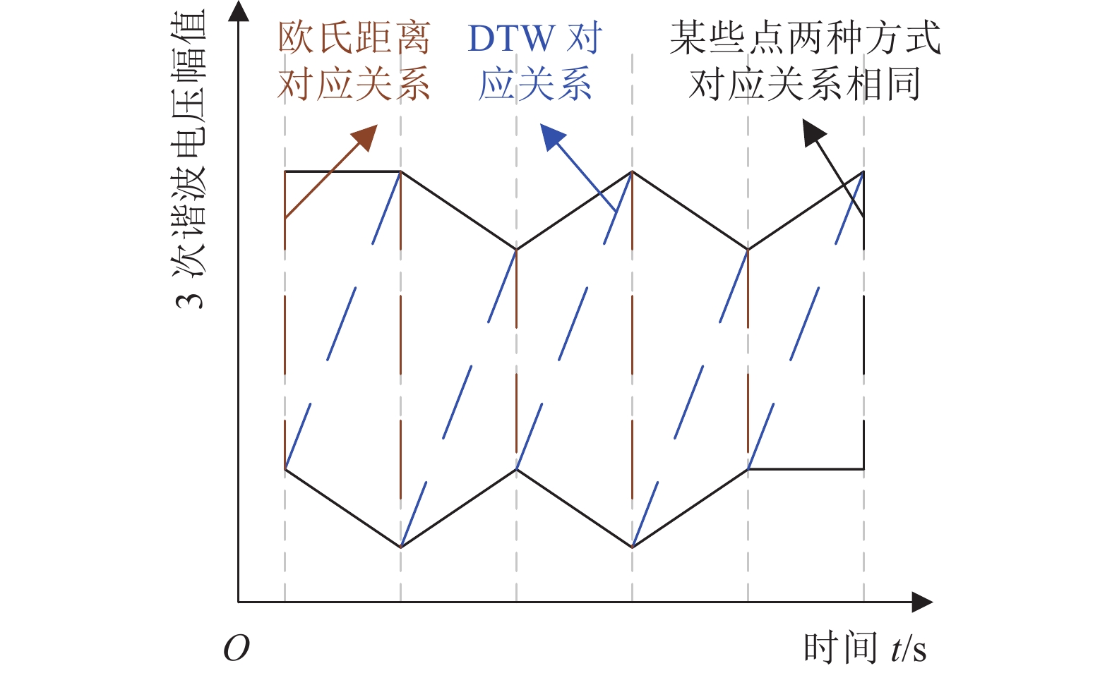 DTW 距离度量函数并非计算同时刻数据的差异,而是对时序间数据点进行非同时刻映射,此时各时序点间对应关系如图3所示。由图3可见,相比于传统欧式距离,该对应方式可准确度量存在时移但局部相似的时序间距离。由于该对应关系使不同时刻时序点得以匹配,故称其实现了时间轴“错位”[29]。