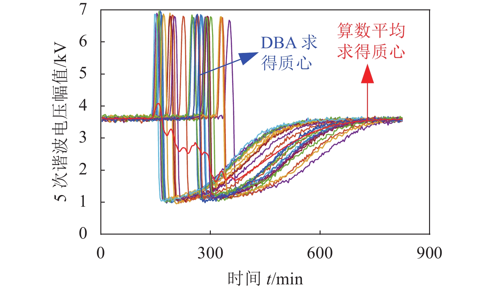 对于具有时移特性的时间序列,采用欧氏距离法和DBA求解得质心如图4所示,图4中,78条曲线代表78个节点谐波电压幅值时序数据。算数平均法求得的质心波形与各样本差异较大且严重失真。相比之下,DBA求得的质心与样本更相似且波形未畸变。从而可知,相比于传统方法,DBA可有效求解时移序列的质心。