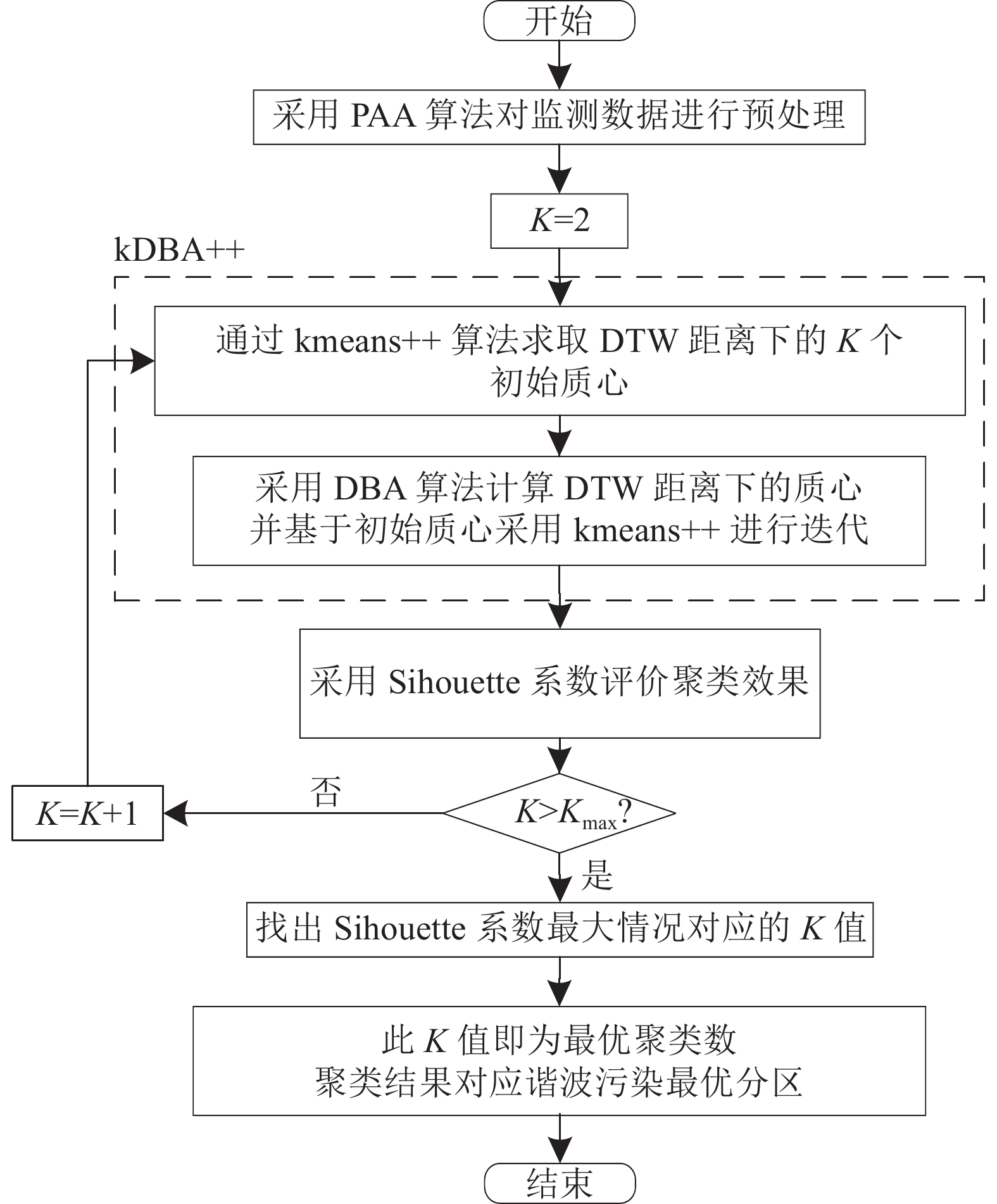 采用Silhouette系数和kDBA++算法开展谐波污染分区工作的整体流程如图5所示,具体步骤如下: