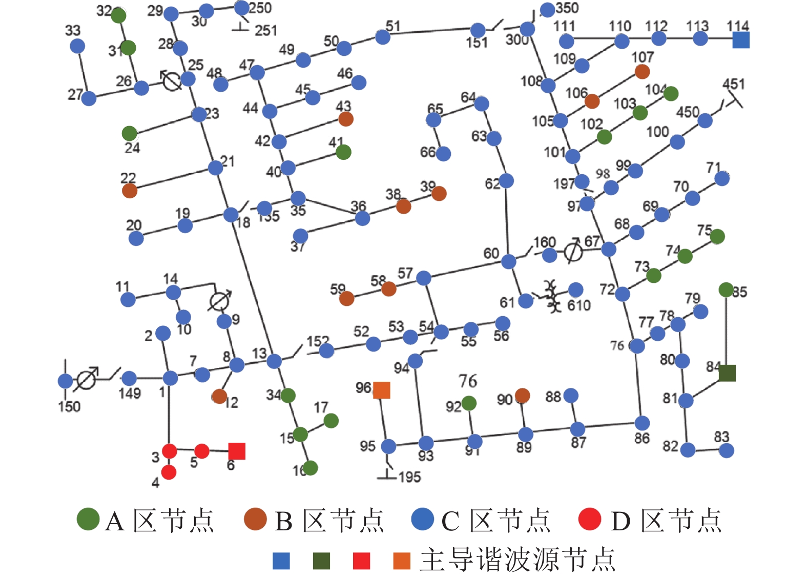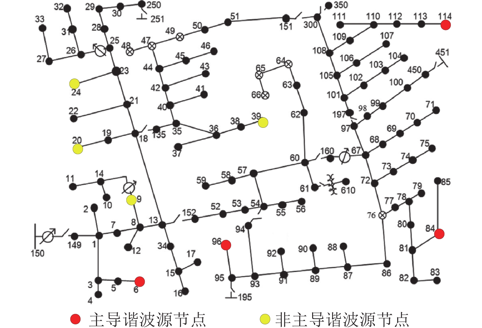 仿真以图6所示IEEE123系统为参考模型,该系统包含123个节点、2台变压器、4个无功补偿电容器。在系统中随机选取8个节点[84,96,114,6,20,24,39,9]注入3次谐波电流。其中:前4个节点注入较大谐波,作为主导谐波源节点;后4个节点注入较小谐波。各谐波源分布如图6所示。