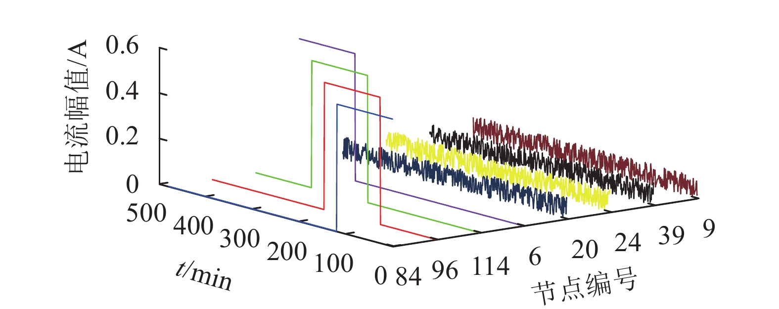 主导谐波源节点注入电流的最大值为0.56 A,考虑谐波源的投切,谐波电流趋势存在一定突变。后4个节点注入谐波幅值为均匀分布的随机变量,作非主导谐波源,设置其均值为0.05 A,极差为0.1 A。上述谐波源时序曲线如图7所示。其中,左边4条曲线分别对应4个主导谐波源节点,右边4条曲线对应4个非主导谐波源节点。