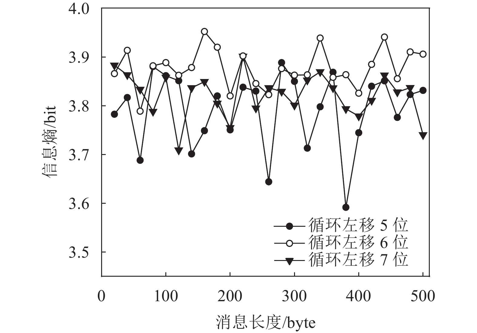 ${{\boldsymbol{G}}_{6 \times 32}}$ 分别进行循环左移5、6、7位操作,输入长度为20~500 byte的样本数据,计算在输入数据相同时的杂凑值信息熵,如图1所示。由图1可以看出,循环左移6位时信息熵数值更高,相对于循环左移5、7位稳定性更好,而循环左移操作的目的是增大比特之间的无规律性,说明构造的加法常数值符合算法设计最初指标,即达到随机性和无规律性最大化,提升了杂凑值随机性。为了评估本文算法的杂凑值随机性,在明文样本相同的情况下,选择典型的密码杂凑算法进行杂凑值的信息熵对比实验,具体标准为:1)本文算法是基于SM3算法的改进杂凑算法,所以选择SM3算法进行对比;2)在杂凑值长度都为256 bit的情况下,选择SHA-256算法进行对比。不同算法的杂凑值信息熵对比实验结果如表2所示。