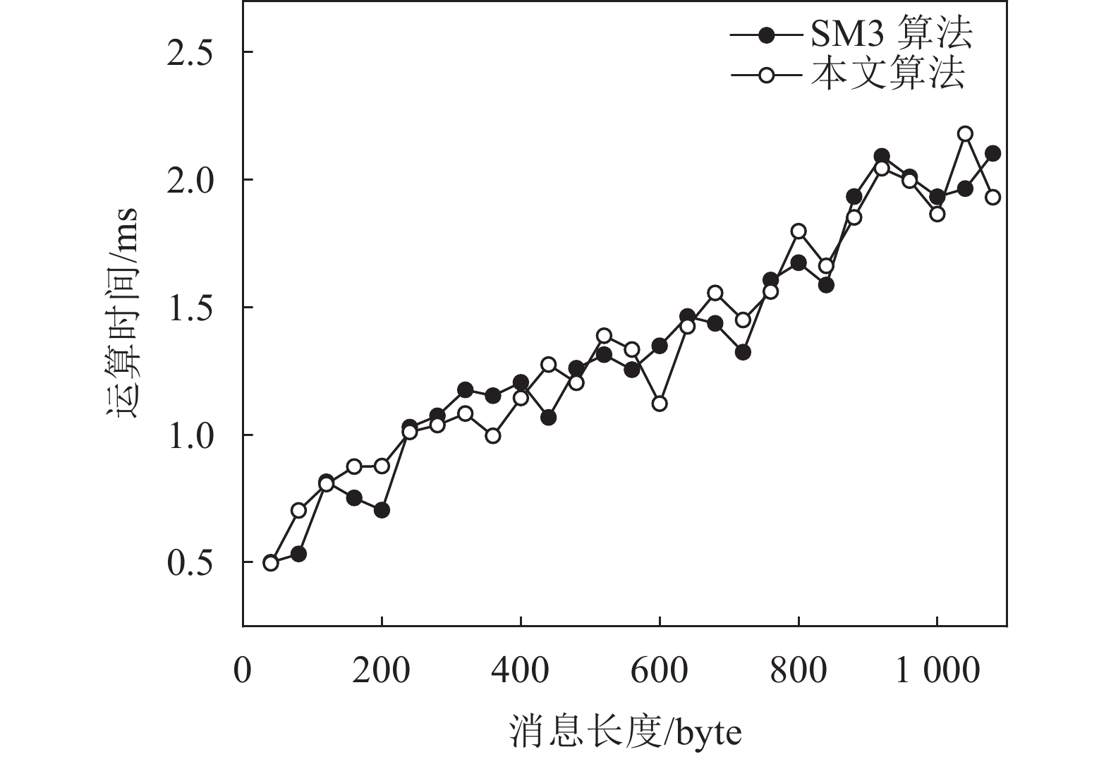 由于迭代结构的串行特性,明文消息长度和运行时间成正比,图2结果表明,本文算法可以支持算法快速运算,在输入明文消息长度为40~1 080 byte的条件下,1 s内可以进行450~2 000次运算,与SM3算法的运算效率基本一致。