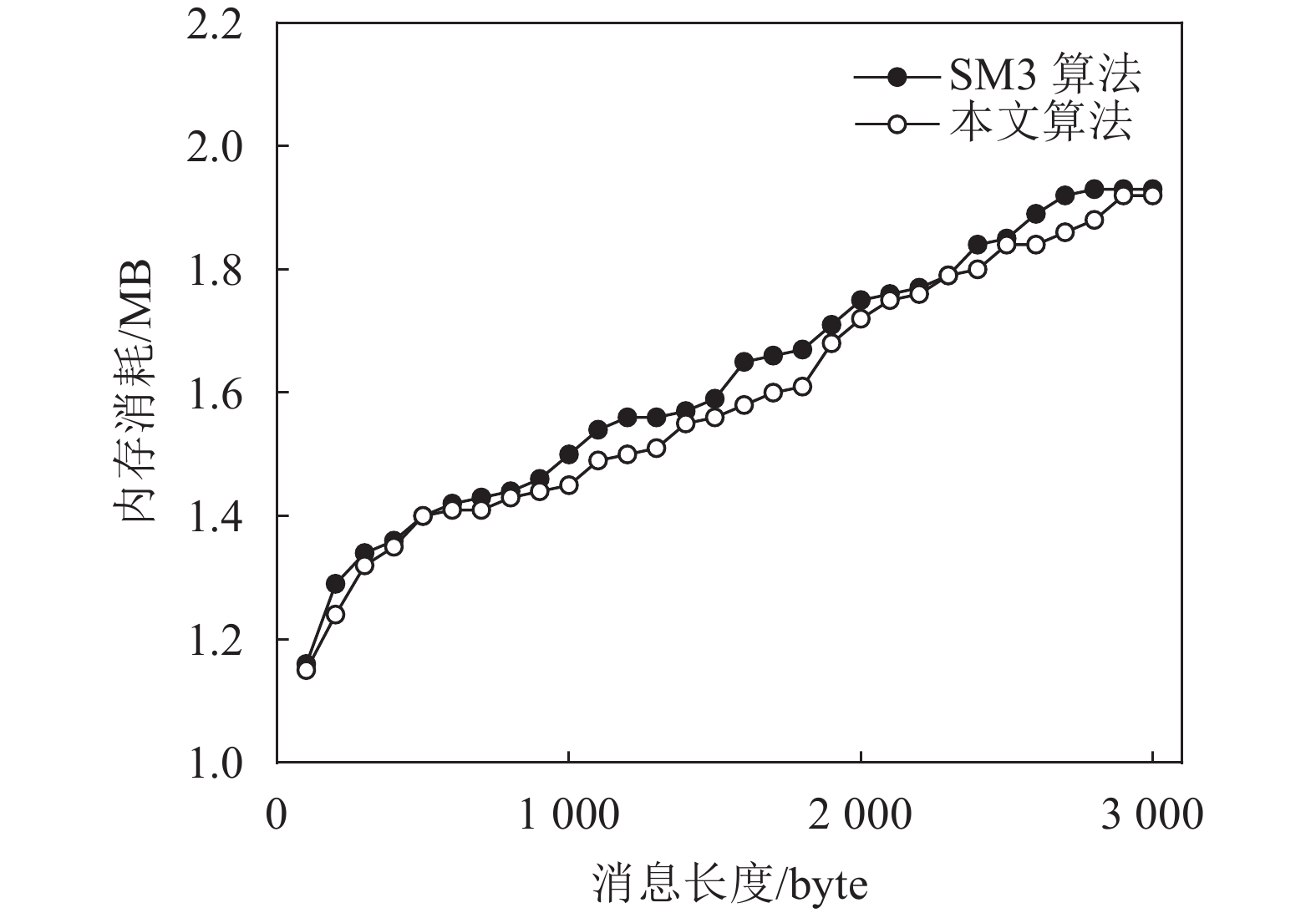 由图3可知:本文算法的内存损耗并不高,在明文输入长度为100~3 000 byte的条件下,随着消息长度的增加,计算量增大,导致内存损耗呈线性增长趋势;同时,由于本文利用纠错码来构造加法常数表,导致在消息长度相同的情况下,本文算法相比于SM3算法内存损耗降低0.01~0.07 MB,实现了性能优化。
